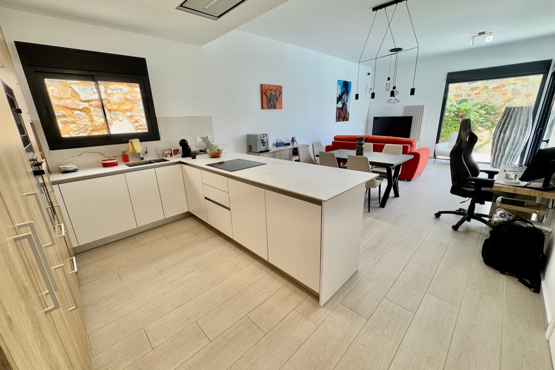 Al entrar, descubrirá un interior amplio y luminoso, con ventanales que inundan el espacio de luz natural y ofrecen vistas panorámicas de la vegetación circundante. La sala de estar y el comedor, de planta abierta, se conectan fácilmente con una elegante cocina totalmente equipada, ideal para recibir invitados o relajarse con estilo.