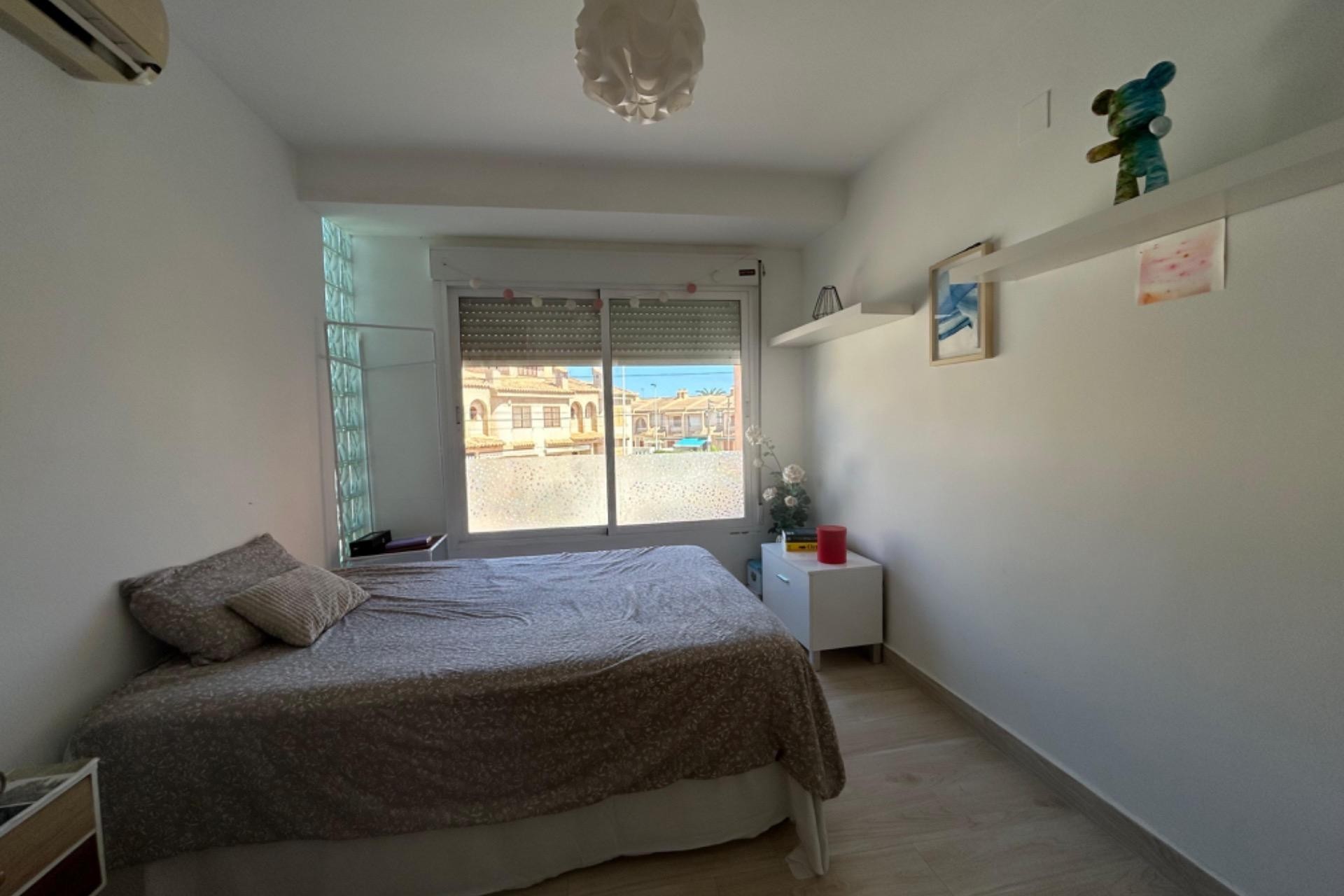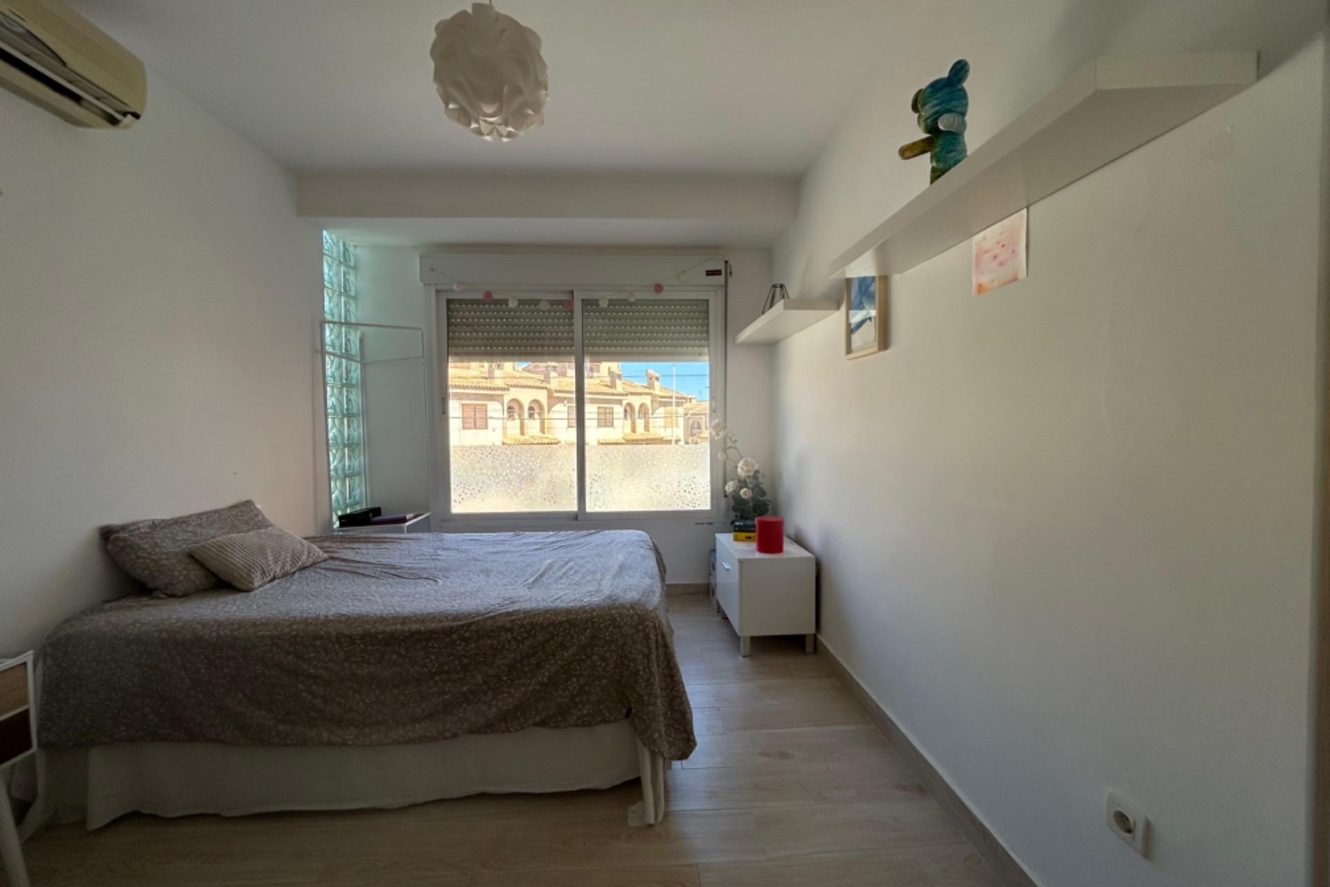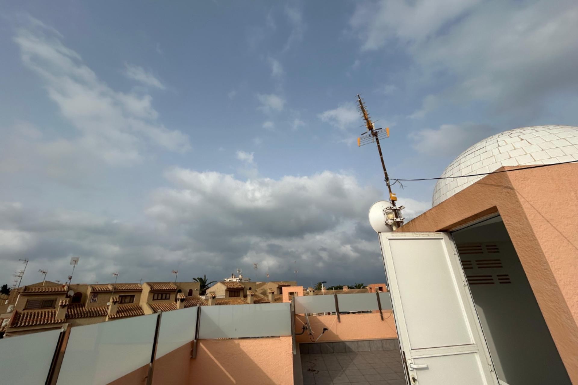Te presentamos esta fantástica villa ubicada en la prestigiosa zona de Los Frutales (Torrevieja), a tan solo 200 metros de la playa. Una vivienda ideal tanto para residencia habitual como para disfrutar de estancias vacacionales en una de las zonas más demandadas de la Costa Blanca.~~La propiedad se distribuye en dos plantas más solárium privado:~•Planta baja: amplio y luminoso salón, gran cocina independiente totalmente equipada, un baño completo y 2 dormitorios. Además, cuenta con un espacio de aparcamiento dentro de la parcela y un práctico trastero.~•Primera planta: encontramos un segundo baño completo, 3 dormitorios y una gran terraza con zona chill out, perfecta para relajarse y disfrutar del clima mediterráneo.~•Segunda planta: un espectacular solárium privado con vistas despejadas, ideal para tomar el sol o compartir momentos únicos al aire libre.~~La villa dispone de piscina privada y, además, dentro de la urbanización tendrás acceso a una piscina comunitaria, lo que añade aún más comodidad y opciones de ocio.~~Con un total de 5 dormitorios, amplias zonas exteriores y una ubicación privilegiada junto al mar, esta propiedad es una gran oportunidad para quienes buscan exclusividad, comodidad y cercanía a la playa.~~