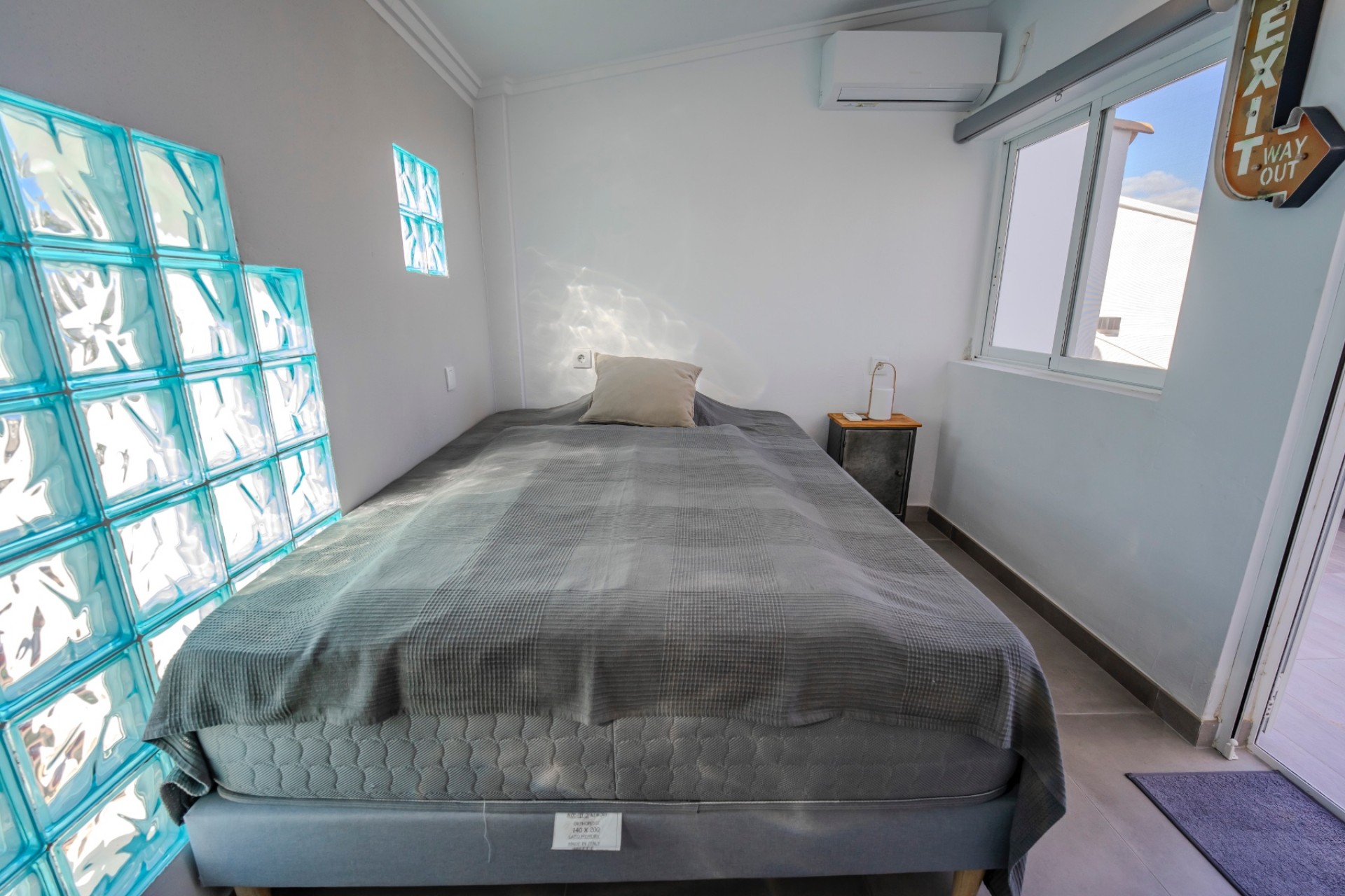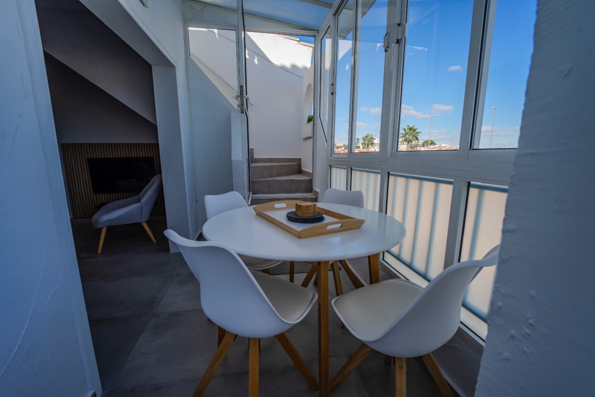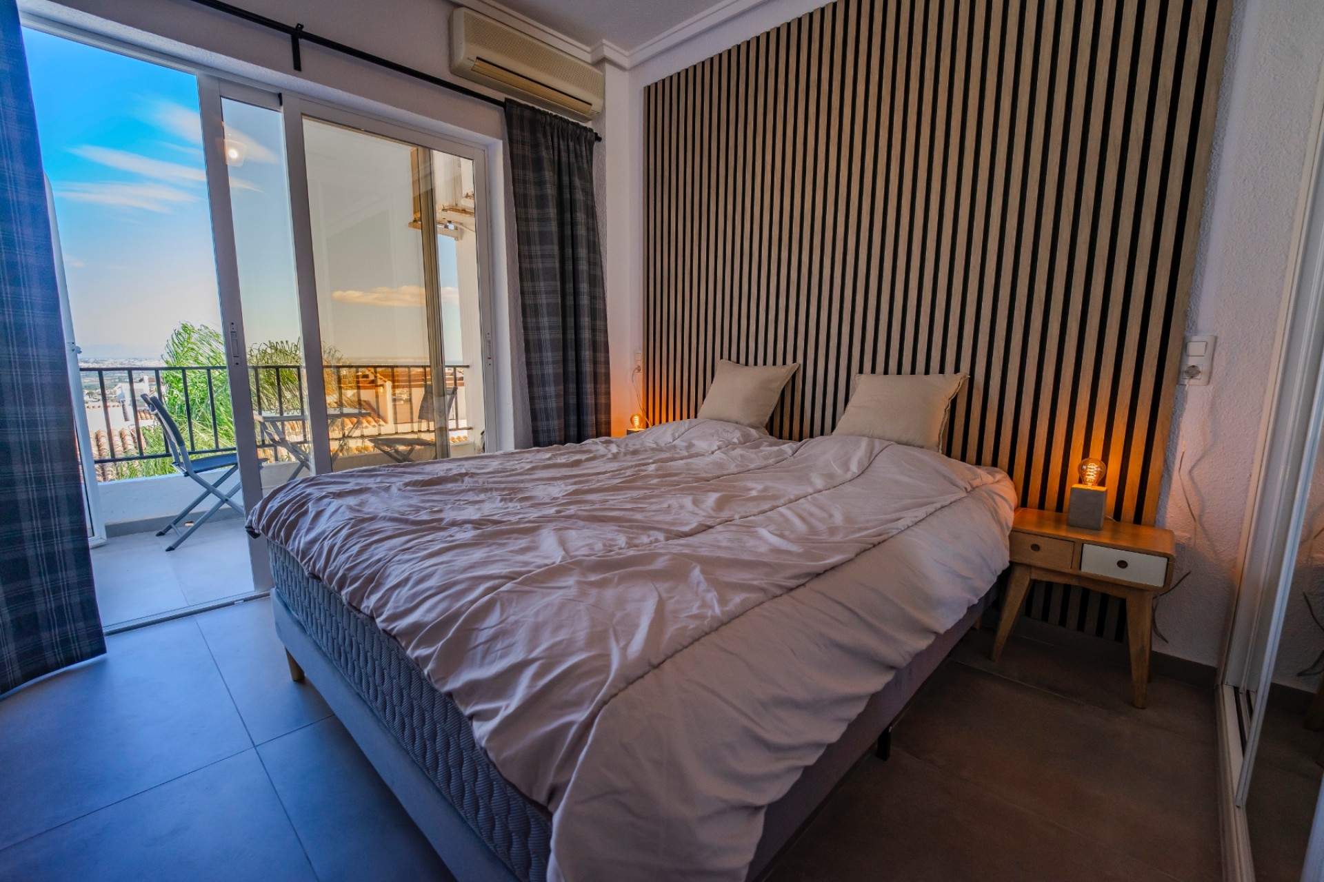 Su singular distribución ofrece privacidad y versatilidad: dos de los tres dormitorios, junto con un baño compartido, conforman una suite independiente en la planta superior, a la que se accede por una escalera exterior que conduce al solárium. Perfecta para familias o parejas que viajan juntas , esta casa ofrece independencia sin aislamiento.