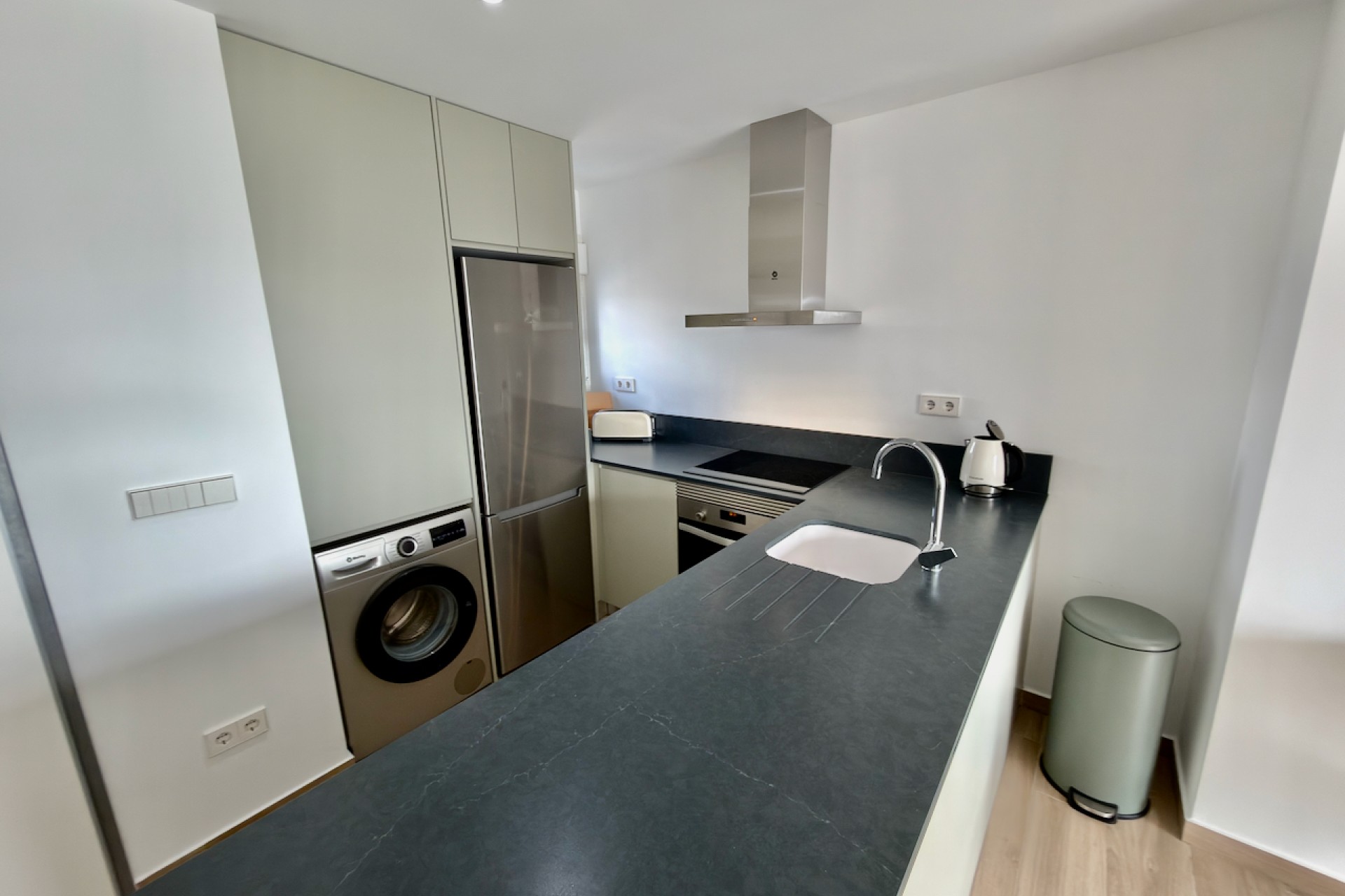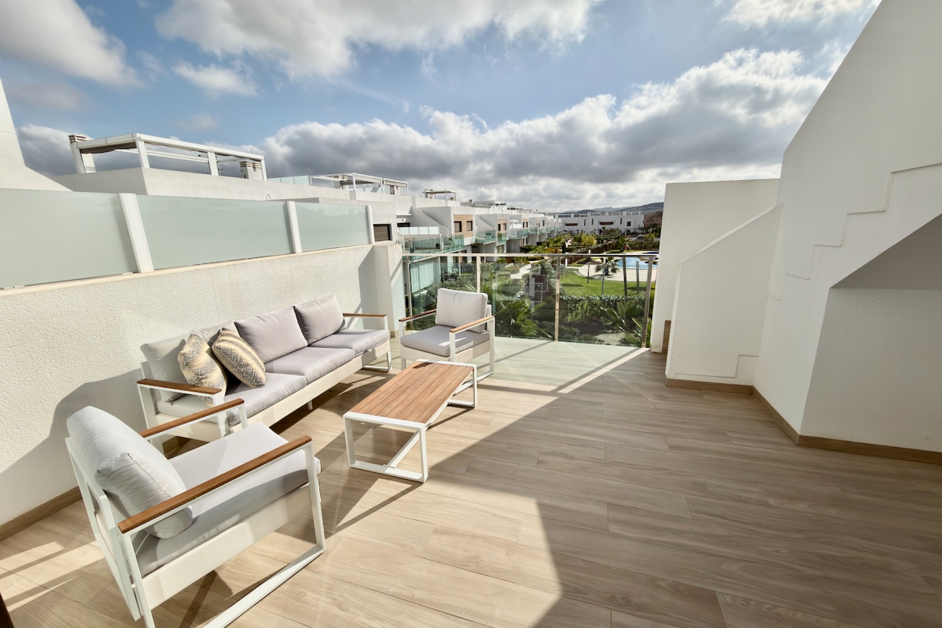 El apartamento cuenta con una cocina totalmente equipada, armarios empotrados en todos los dormitorios y está amueblado con un alto nivel de calidad; el mobiliario es negociable. Disfrute del aire libre en una terraza privada y un amplio solárium, perfectos para relajarse o recibir invitados mientras contempla las preciosas vistas a los jardines comunitarios y la urbanización.
