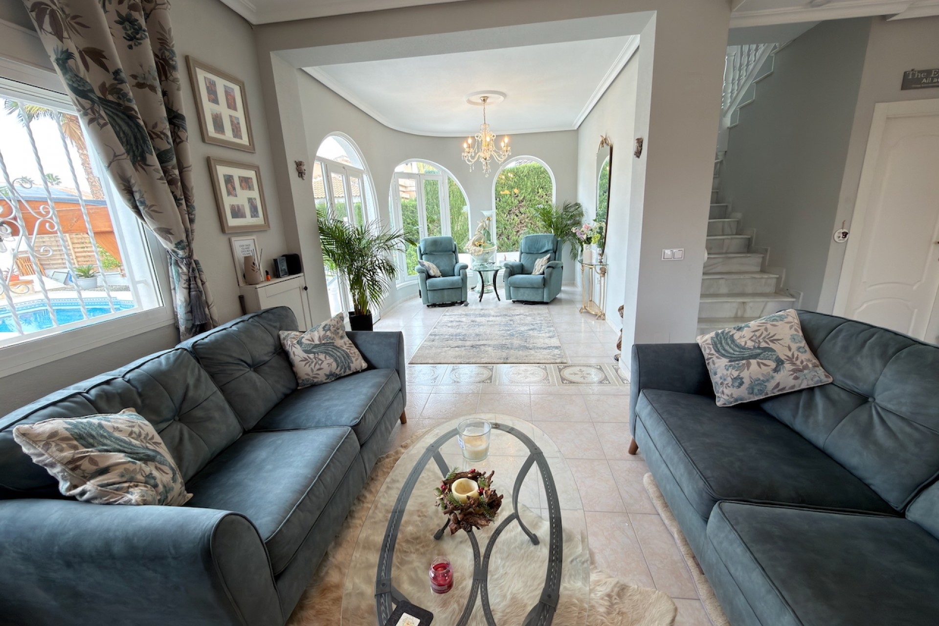 La propiedad cuenta con tres amplios dormitorios , todos con armarios empotrados , y tres baños modernos , lo que la convierte en una opción ideal para familias, vacaciones o inversión. El salón-comedor de planta abierta es luminoso y acogedor, realzado por una chimenea y amplios ventanales con vistas a la piscina privada y los jardines .