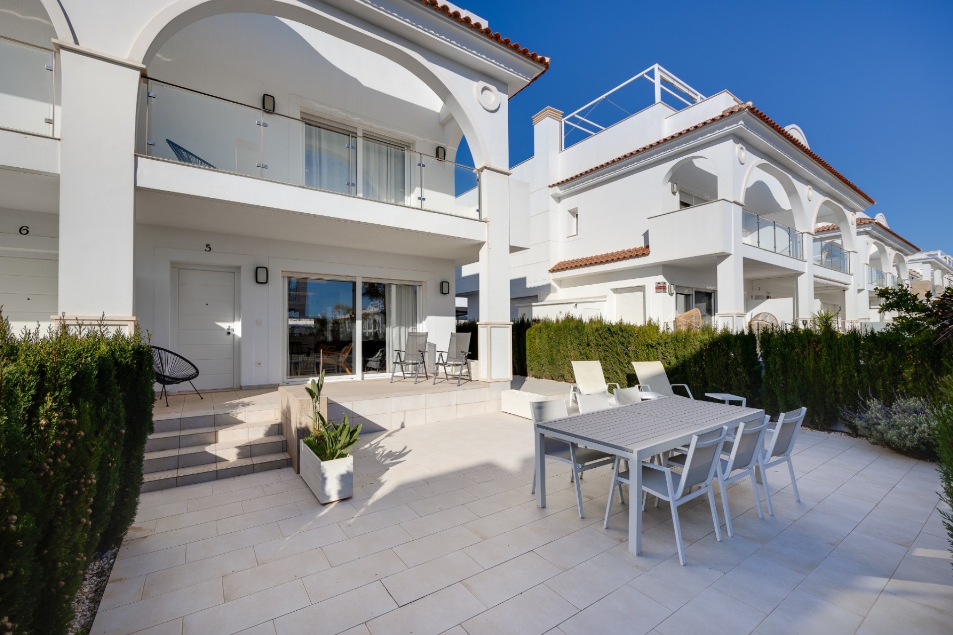 La casa tiene una superficie útil de 122 m² distribuidos en dos plantas y cuenta con 3 amplios dormitorios y 2 hermosos baños. La parcela privada de aprox. 200 m² ofrece varios y hermosos espacios exteriores, incluyendo una gran terraza en la azotea con amplio espacio para tumbonas, zona de estar y comedor al aire libre.