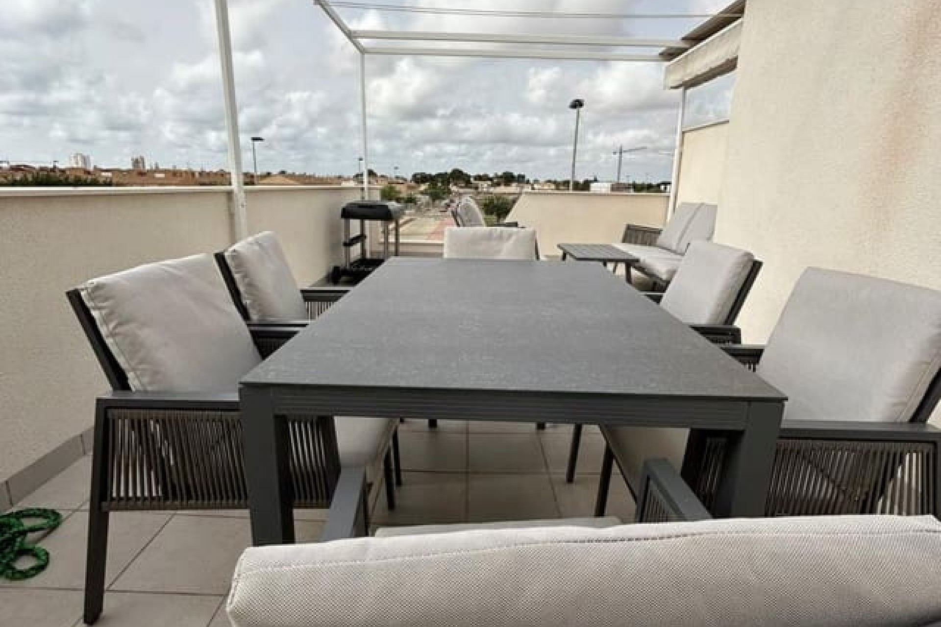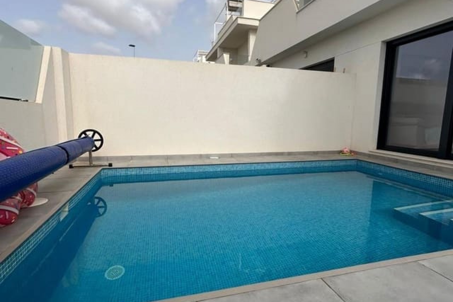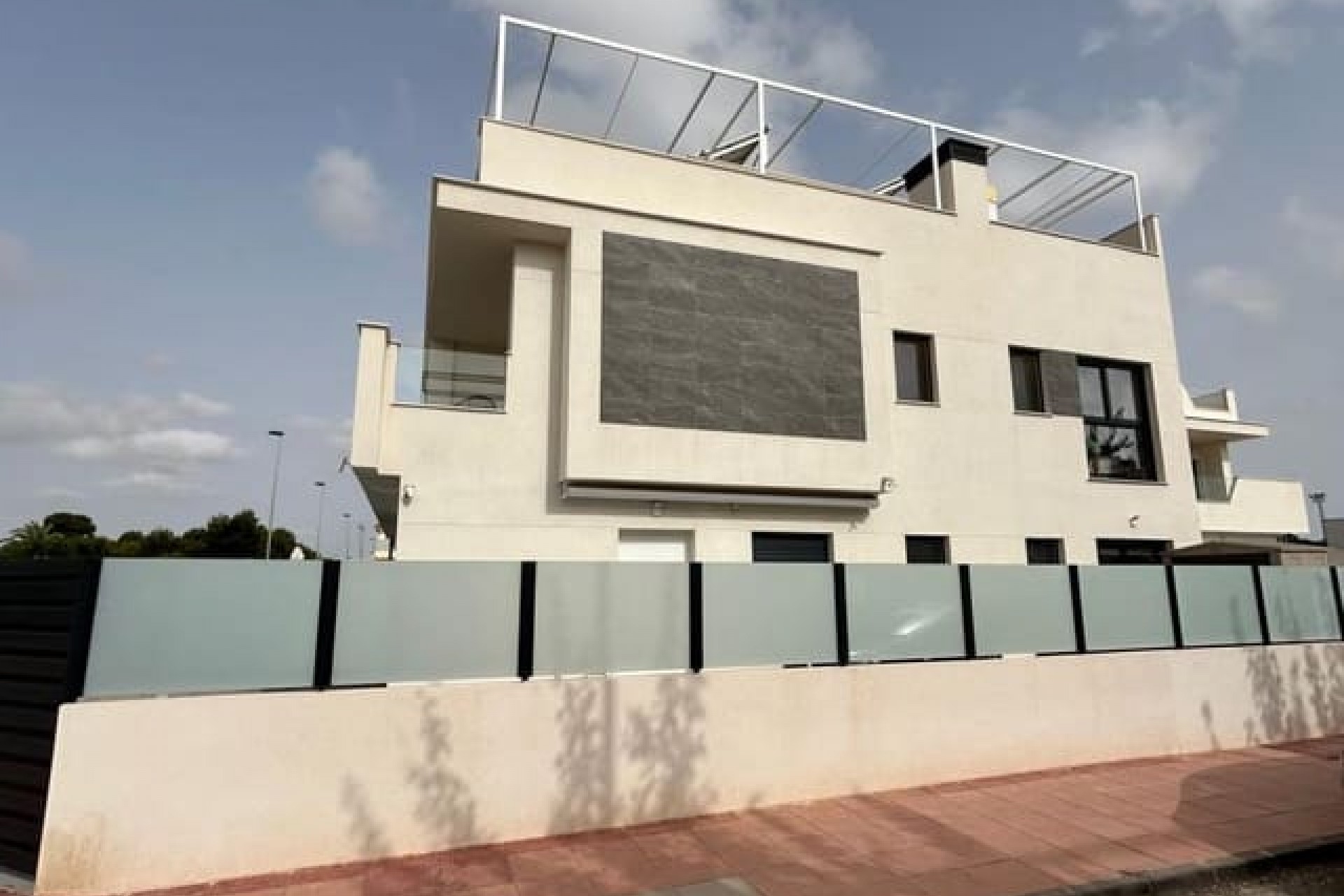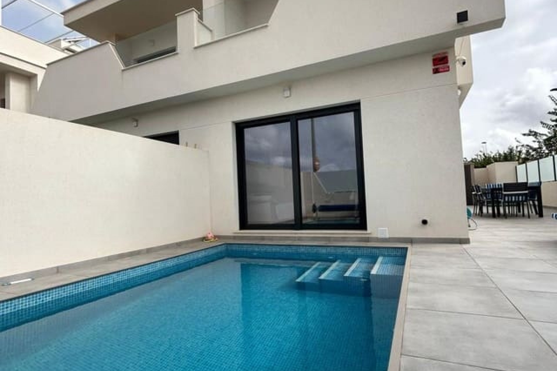 Tomannsbolig sør-/østvendt villa med 3 soverom og 2 bad, privat basseng og privat takterrasse i Santiago de la Ribera. Stor tomt med inngjerdet innkjørsel som fører til en stor terrasse foran. Det store svømmebassenget ligger foran eiendommen, og det er god plass til å spise og sole seg. Huset har en stor stue med utsikt over bassenget og et moderne, åpent kjøkken med fullt utstyrt kjøkken. Bak kjøkkenet er det et dobbelt soverom med innebygde garderober og en dør som fører til sideterrassen. Det er også et moderne dusjrom i første etasje. I første etasje er det to doble soverom med innebygde garderober. Soverommet foran huset har tilgang til en terrasse. I denne første etasjen er det også et moderne dusjrom. Det er trapper fra første etasje som fører deg til ditt eget private takterrasseområde med utendørs kjøkkenområde. Nok et fantastisk utendørs oppholdsrom. Dette huset er bare to år gammelt og vil bli solgt fullt møblert. Det ligger i gangavstand til stranden og en kort kjøretur til Dos Mares kjøpesenter og Pinatar kjøpesenter. Murcia flyplass ligger omtrent 30 minutters kjøretur unna, og Alicante ligger omtrent 1 times kjøretur unna. Det finnes også noen barer og kafeer i nærheten av eiendommen. Santiago de la Ribera er en vakker by ved bredden av Mar Menor. Det er kystområdet i byen San Javier og startet som en enkel fiskerlandsby. Den har nå blitt et populært feriemål, som tiltrekker seg ikke bare spanjoler, men også turister fra hele Europa. Santiago har en moderne følelse, selv om den fortsatt har beholdt sin «fiskerlandsby»-atmosfære. Den har en veldig vakker promenade med majestetiske palmer og 2 kilometer med vakre sandstrender. Herfra kan du ta en båttur over det rolige vannet i Mar Menor, til La Manga-stripen på den andre siden. Hovedhandleområdet ligger egentlig i byen San Javier, men det er noen butikker i de smale gatene å kikke i, prøv det på en onsdag morgen når det er et stort gatemarked.