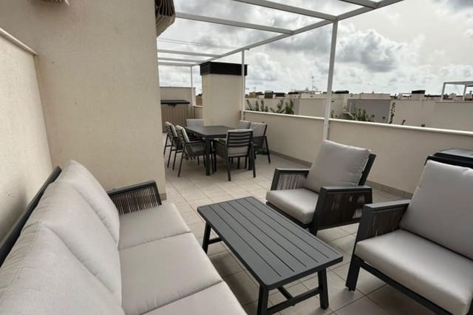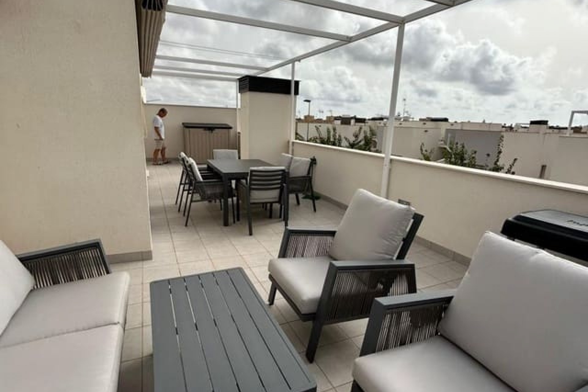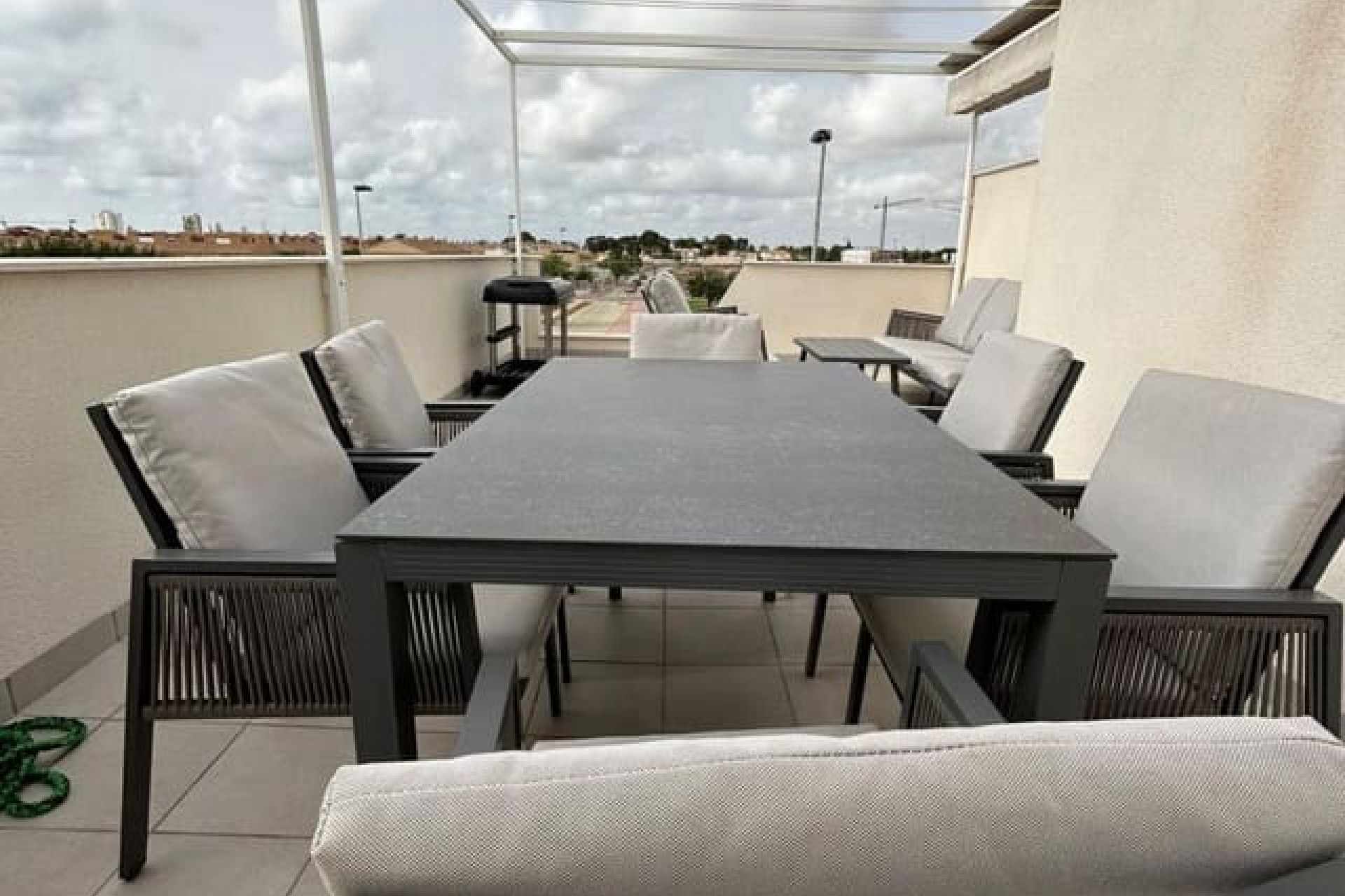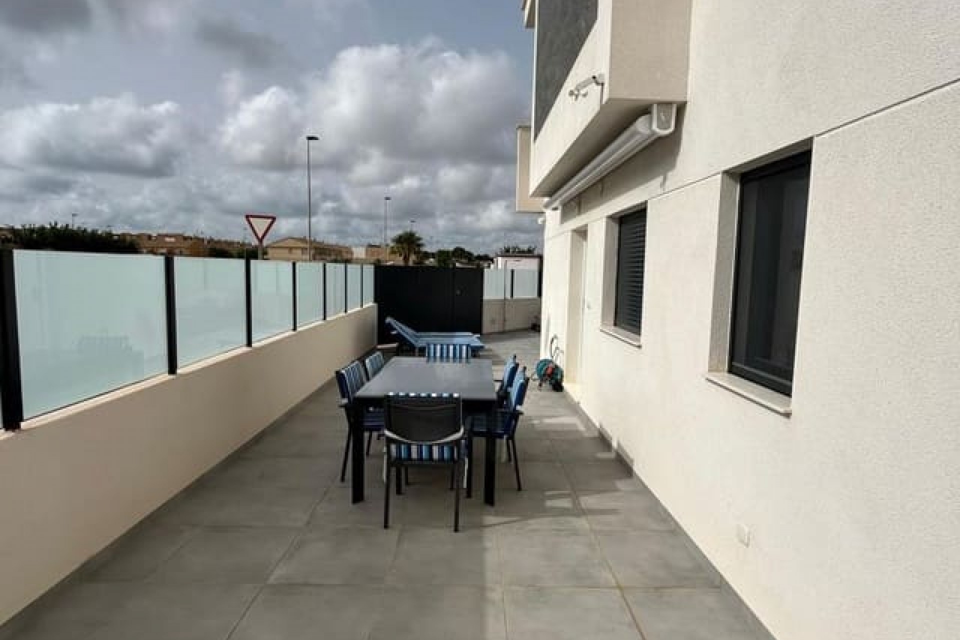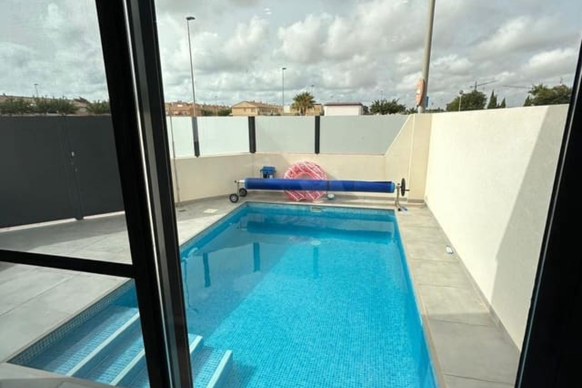 Tomannsbolig sør-/østvendt villa med 3 soverom og 2 bad, privat basseng og privat takterrasse i Santiago de la Ribera. Stor tomt med inngjerdet innkjørsel som fører til en stor terrasse foran. Det store svømmebassenget ligger foran eiendommen, og det er god plass til å spise og sole seg. Huset har en stor stue med utsikt over bassenget og et moderne, åpent kjøkken med fullt utstyrt kjøkken. Bak kjøkkenet er det et dobbelt soverom med innebygde garderober og en dør som fører til sideterrassen. Det er også et moderne dusjrom i første etasje. I første etasje er det to doble soverom med innebygde garderober. Soverommet foran huset har tilgang til en terrasse. I denne første etasjen er det også et moderne dusjrom. Det er trapper fra første etasje som fører deg til ditt eget private takterrasseområde med utendørs kjøkkenområde. Nok et fantastisk utendørs oppholdsrom. Dette huset er bare to år gammelt og vil bli solgt fullt møblert. Det ligger i gangavstand til stranden og en kort kjøretur til Dos Mares kjøpesenter og Pinatar kjøpesenter. Murcia flyplass ligger omtrent 30 minutters kjøretur unna, og Alicante ligger omtrent 1 times kjøretur unna. Det finnes også noen barer og kafeer i nærheten av eiendommen. Santiago de la Ribera er en vakker by ved bredden av Mar Menor. Det er kystområdet i byen San Javier og startet som en enkel fiskerlandsby. Den har nå blitt et populært feriemål, som tiltrekker seg ikke bare spanjoler, men også turister fra hele Europa. Santiago har en moderne følelse, selv om den fortsatt har beholdt sin «fiskerlandsby»-atmosfære. Den har en veldig vakker promenade med majestetiske palmer og 2 kilometer med vakre sandstrender. Herfra kan du ta en båttur over det rolige vannet i Mar Menor, til La Manga-stripen på den andre siden. Hovedhandleområdet ligger egentlig i byen San Javier, men det er noen butikker i de smale gatene å kikke i, prøv det på en onsdag morgen når det er et stort gatemarked.