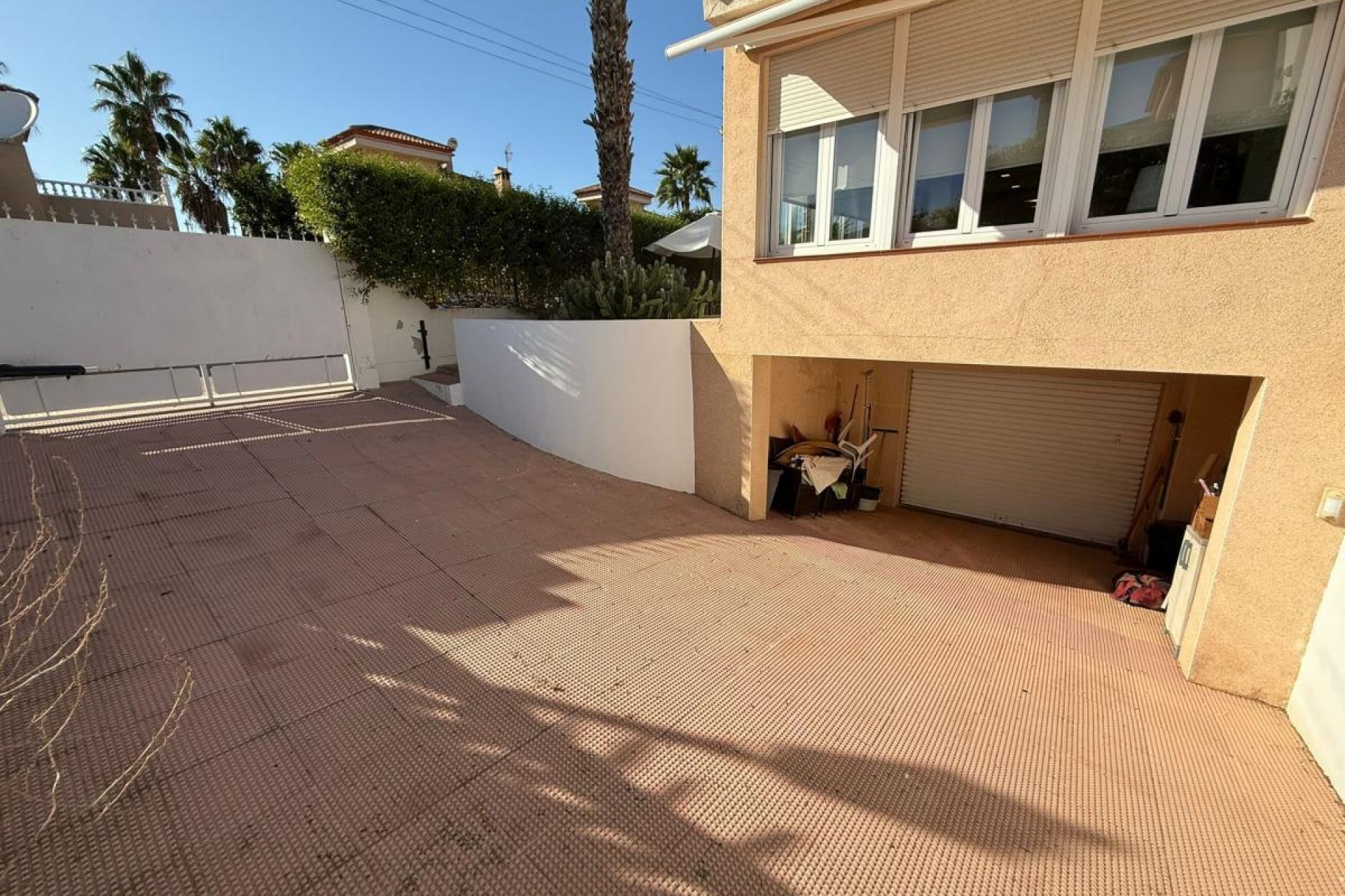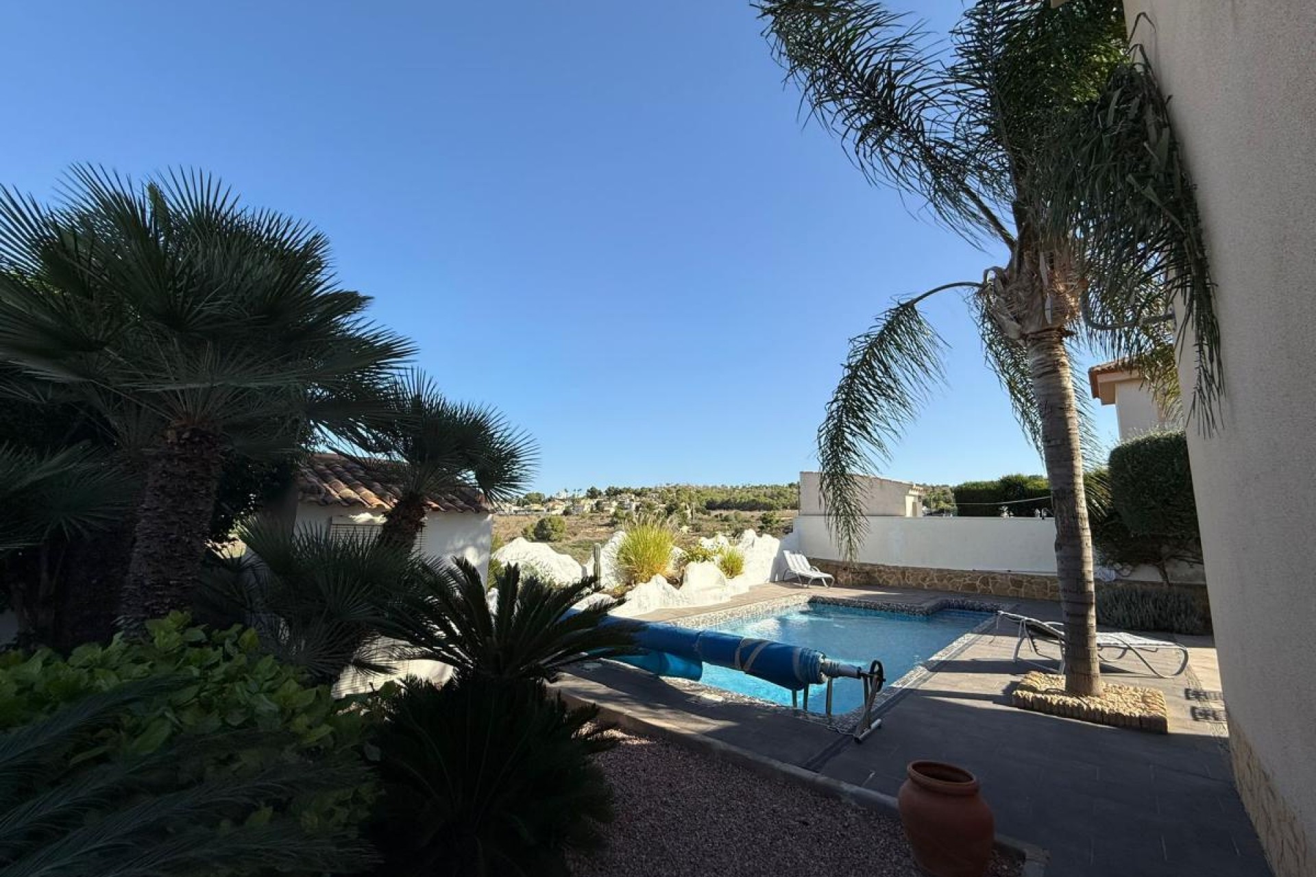 Tomten på 511 m² er vakkert anlagt og utstråler middelhavssjarm. Modne palmetrær og fargerike busker skaper en grønn oase rundt huset. Det romslige private bassenget er hagens midtpunkt og er omgitt av solrike terrasser, perfekt for å tilbringe lange sommerdager eller nyte koselige kvelder med familie og venner.