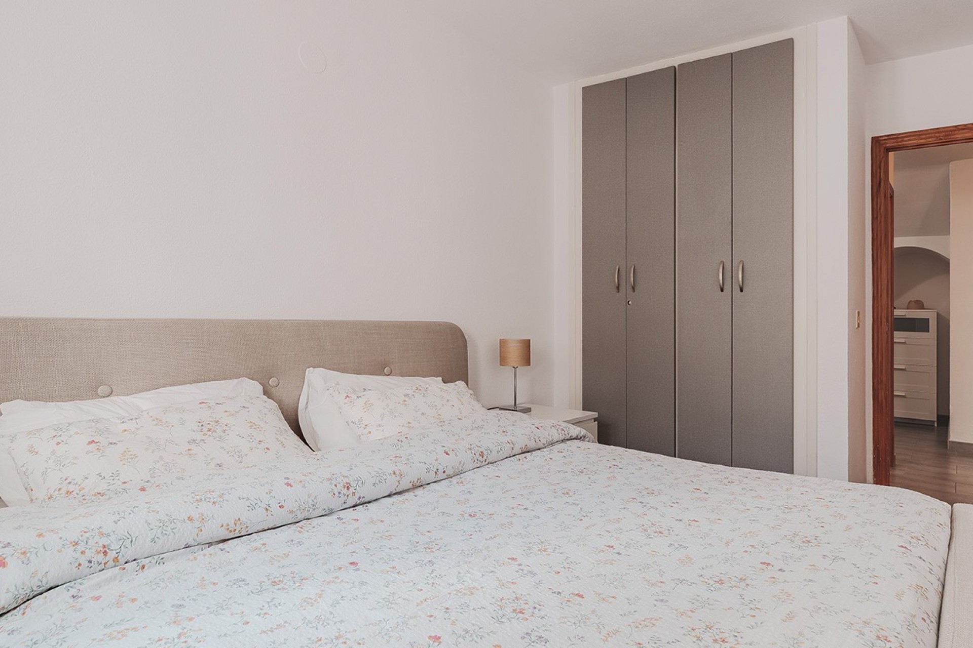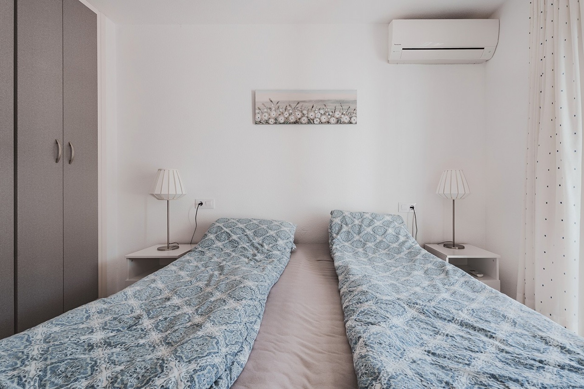 Boligen har tre soverom: to med dobbeltsenger og ett med to enkeltsenger, alle med innebygde garderober og rikelig med naturlig lys.