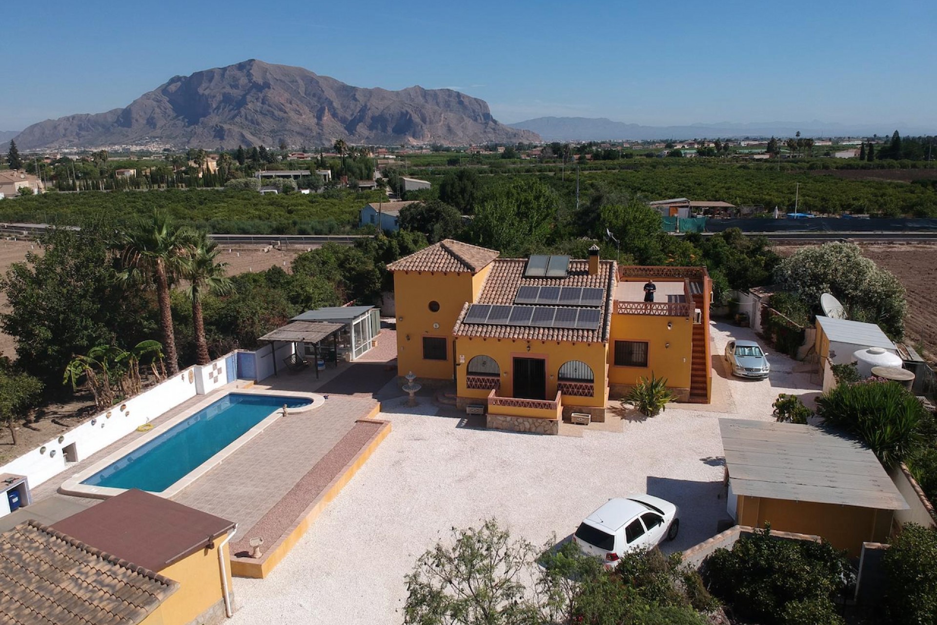 Orienteringen av eiendommen som vender mot sør gir rikelig med naturlig lys hele dagen, og skaper en varm og innbydende atmosfære. Nyt fantastisk utsikt over bassenget, fjellene og landskapet fra komforten av ditt eget hjem. Fincaen har 3 innebygde garderober, klimaanlegg, takvifter og en peis for ekstra komfort og luksus.