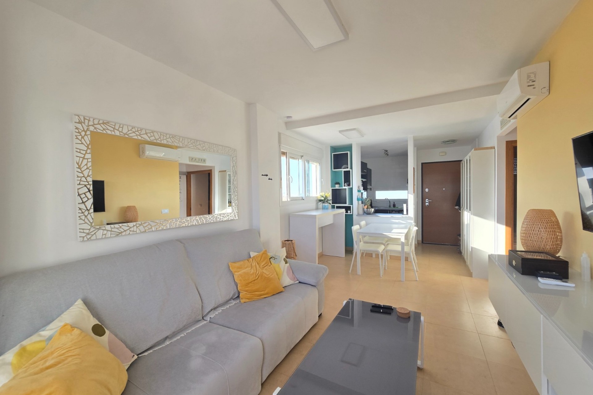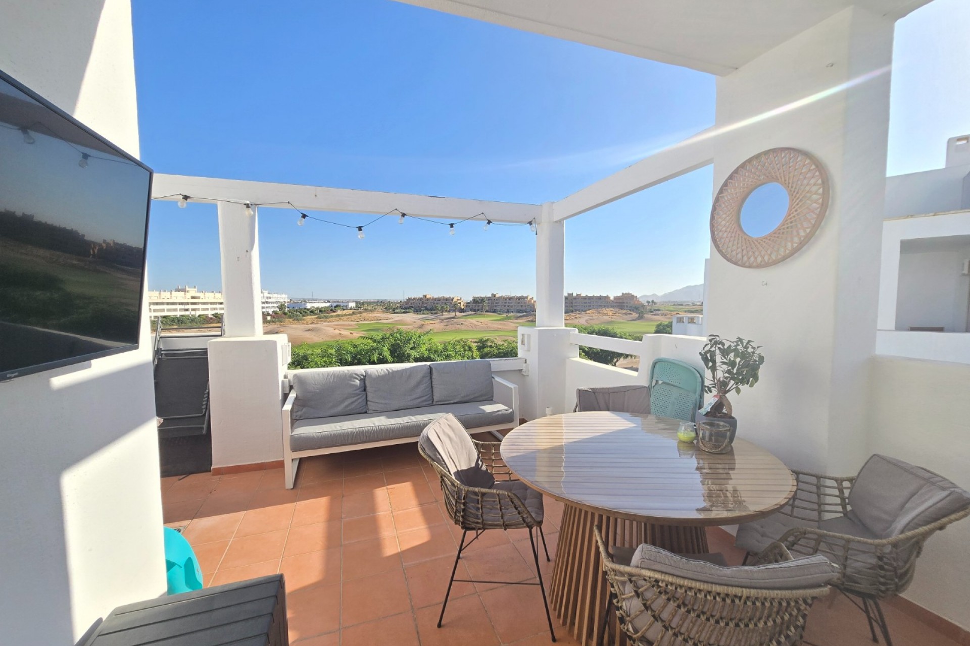 To gotowe do zamieszkania mieszkanie oferuje 2 sypialnie, 1 nowoczesną łazienkę oraz jasną, otwartą kuchnię, płynnie przechodzącą w salon. Duże, przesuwne okna wychodzą na przestronny, prywatny taras z panoramicznym widokiem na zieloną okolicę i pole golfowe. Do dyspozycji Gości jest również wspólny taras solarium – idealny do relaksu i korzystania ze słońca.