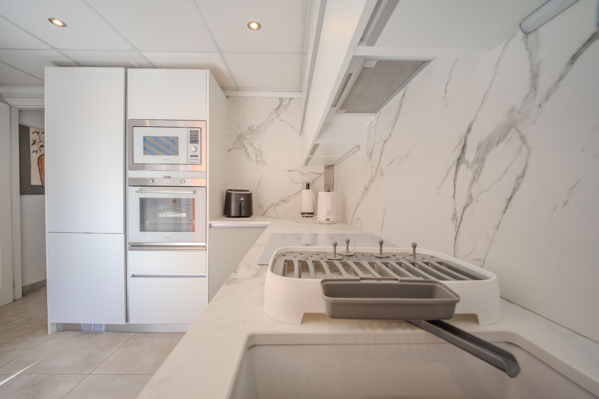 W pełni wyposażona kuchnia z dużą ilością miejsca do przechowywania i nowoczesnym wykończeniem, zaprojektowana z myślą o praktyczności i codziennym użytkowaniu.