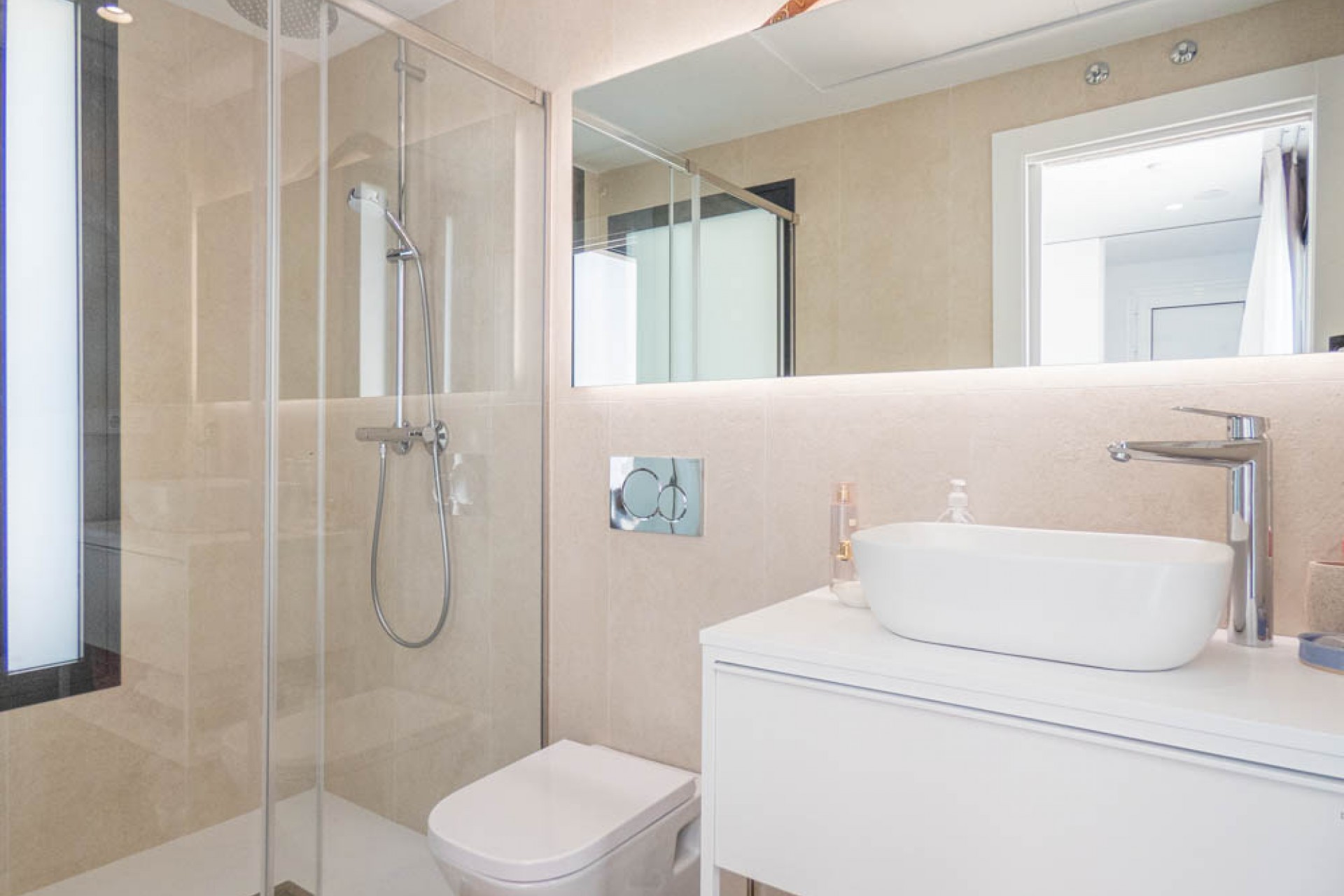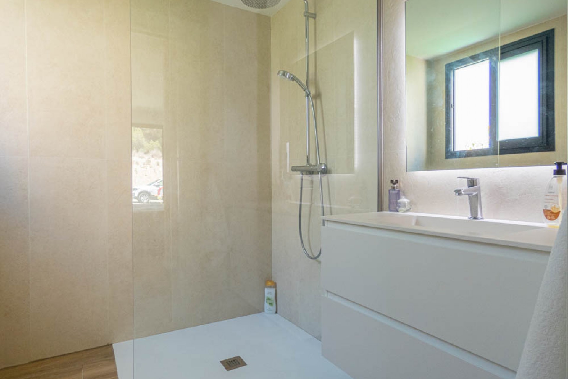 Here is an overview of the villa, as you enter the property you walk into a large open plan living area with lots of natural light, as you have a wall of glass, that takes you outside to a split porch/lower terrace and an infinity pool with amazing views over the golf course. Walking back inside the current owners have created a relaxed feel as there is ample room to relax and dine, at the far end you have a modern kitchen. As you turn from the kitchen you have a garden area that also allows light into the villa, as you keep walking round and passed the stairs you have the first guest bedroom, opposite this is a family bathroom and at the end, you have the second guest bedroom which has its own en-suite shower room.