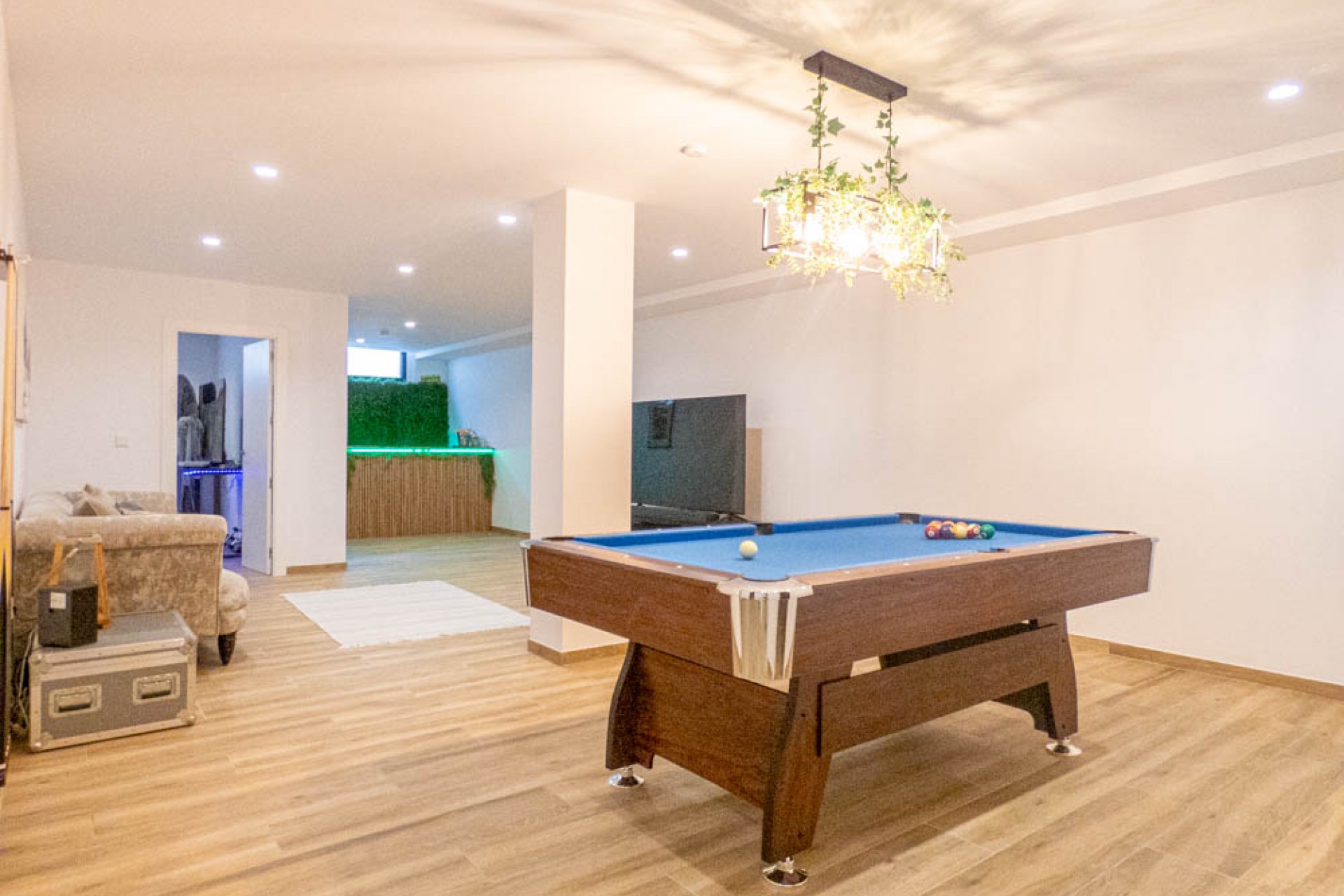 Moving back to the stairs which provides access up or down, if you go up first, you have the master bedroom, which has a walk through wardrobe and its own en-suite shower room, this bedroom has glass sliding doors out to a roof top solarium with some amazing views across the golf course and to the hills in the distance! Moving back inside and taking the stairs all the way down, this is where you have a real surprise. There is a basement, which offers a lounge area to relax, watch TV or have a game of pool and if you fancy a drink there is a bar at the far end. This level also benefits from having three more guest bedrooms, so when you have friends round, they can have their own space if they wish, the choice is theirs.