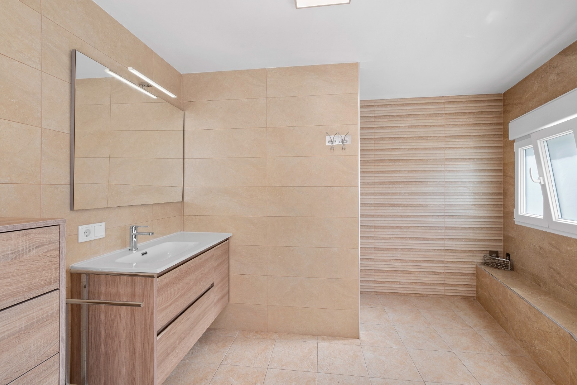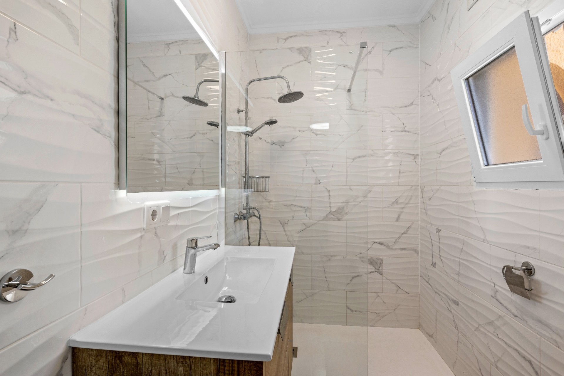 Inside, you’ll find five spacious bedrooms and three modern bathrooms, including a luxurious master ensuite. The property has been tastefully renovated in a modern style, combining contemporary finishes with timeless character. The separate fully fitted kitchen comes equipped with modern white goods and opens to a bright, inviting living area featuring a cozy fireplace and access to a glazed terrace — perfect for year-round relaxation while enjoying the breathtaking views.