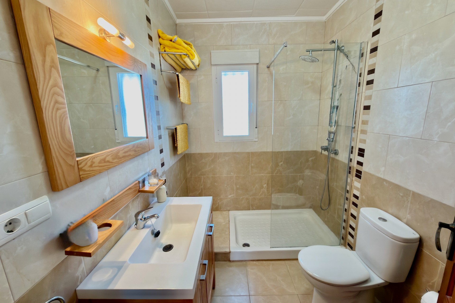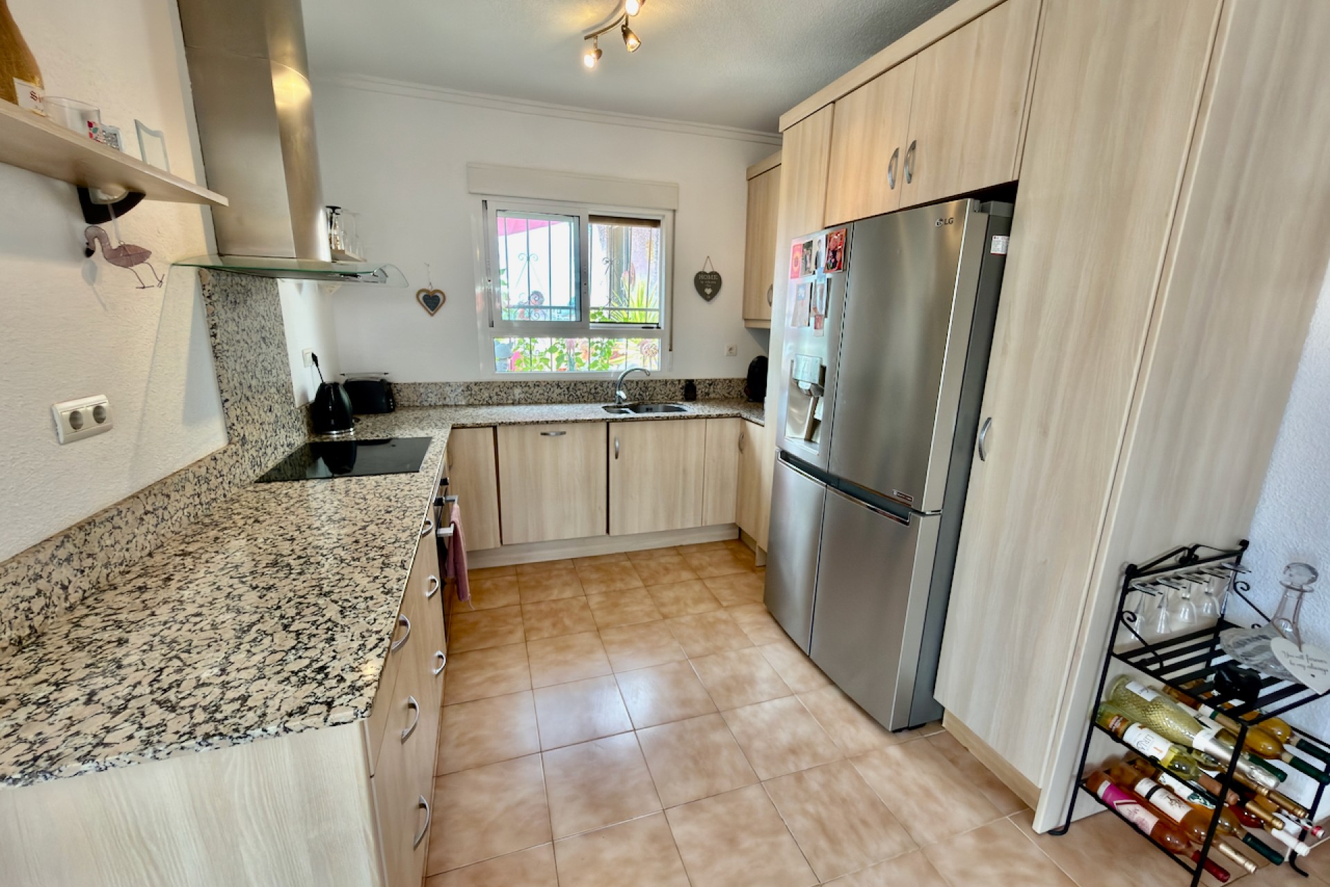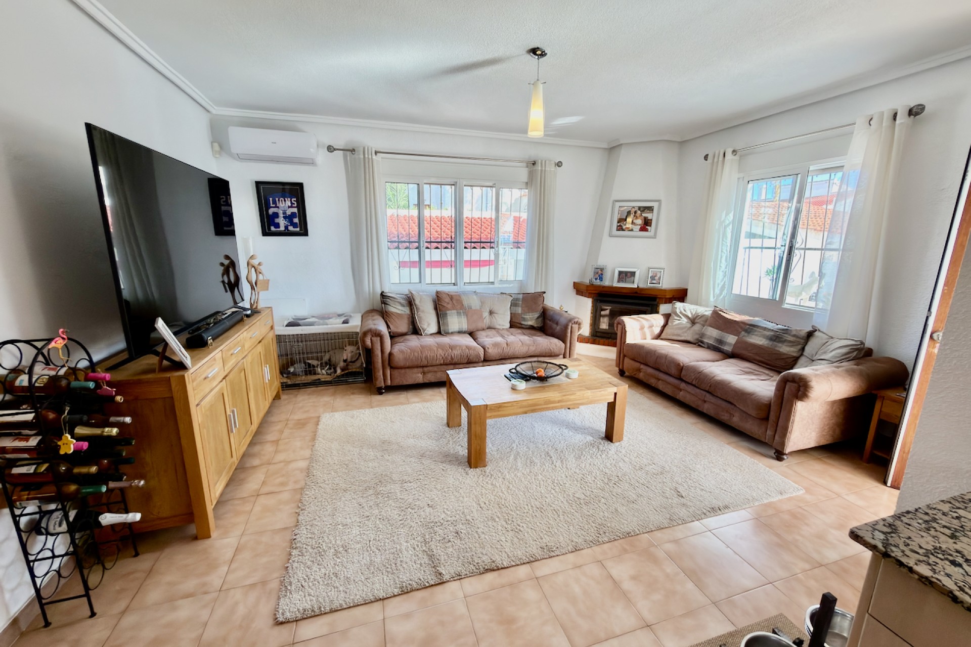 Inside, the villa features a bright open-plan living and dining area with a fireplace, air conditioning, and ceiling fansfor all-season comfort. The American-style kitchen comes fully fitted with quality white goods, and there’s a utility room and storage space for added convenience.