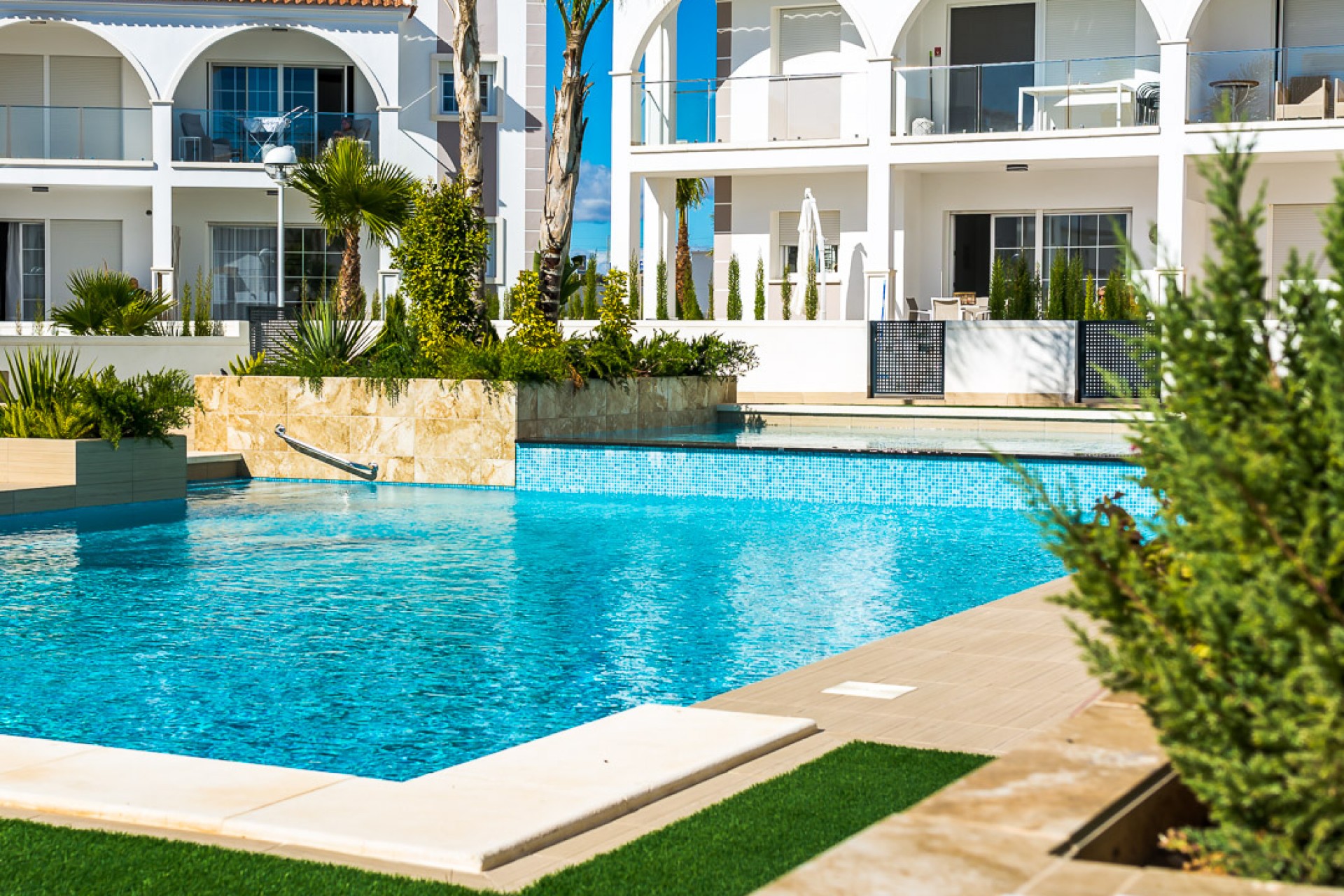 The complex has large areas with beautiful green gardens and a communal swimming pool.