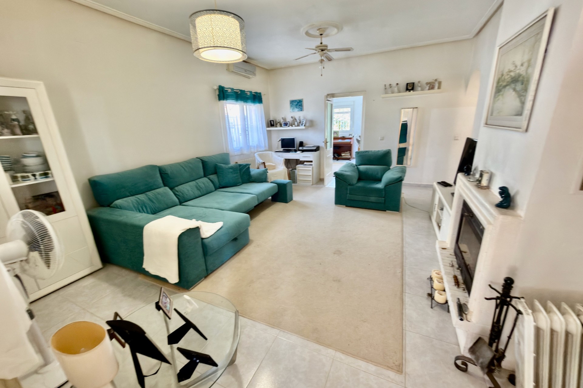 The villa features a welcoming living area with a fireplace, complemented by air conditioning, ceiling fans, and gas central heating, ensuring year-round comfort. A separate fully fitted kitchen comes complete with white goods and is supported by a practical utility room for added convenience.