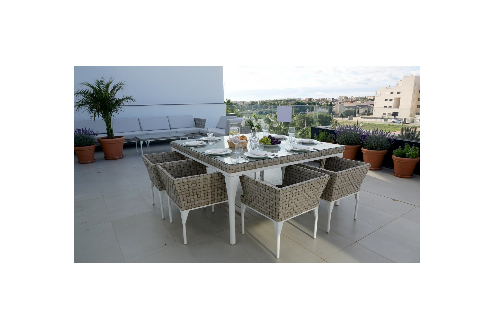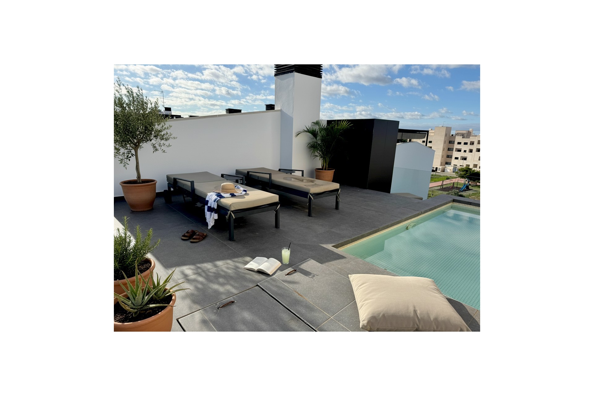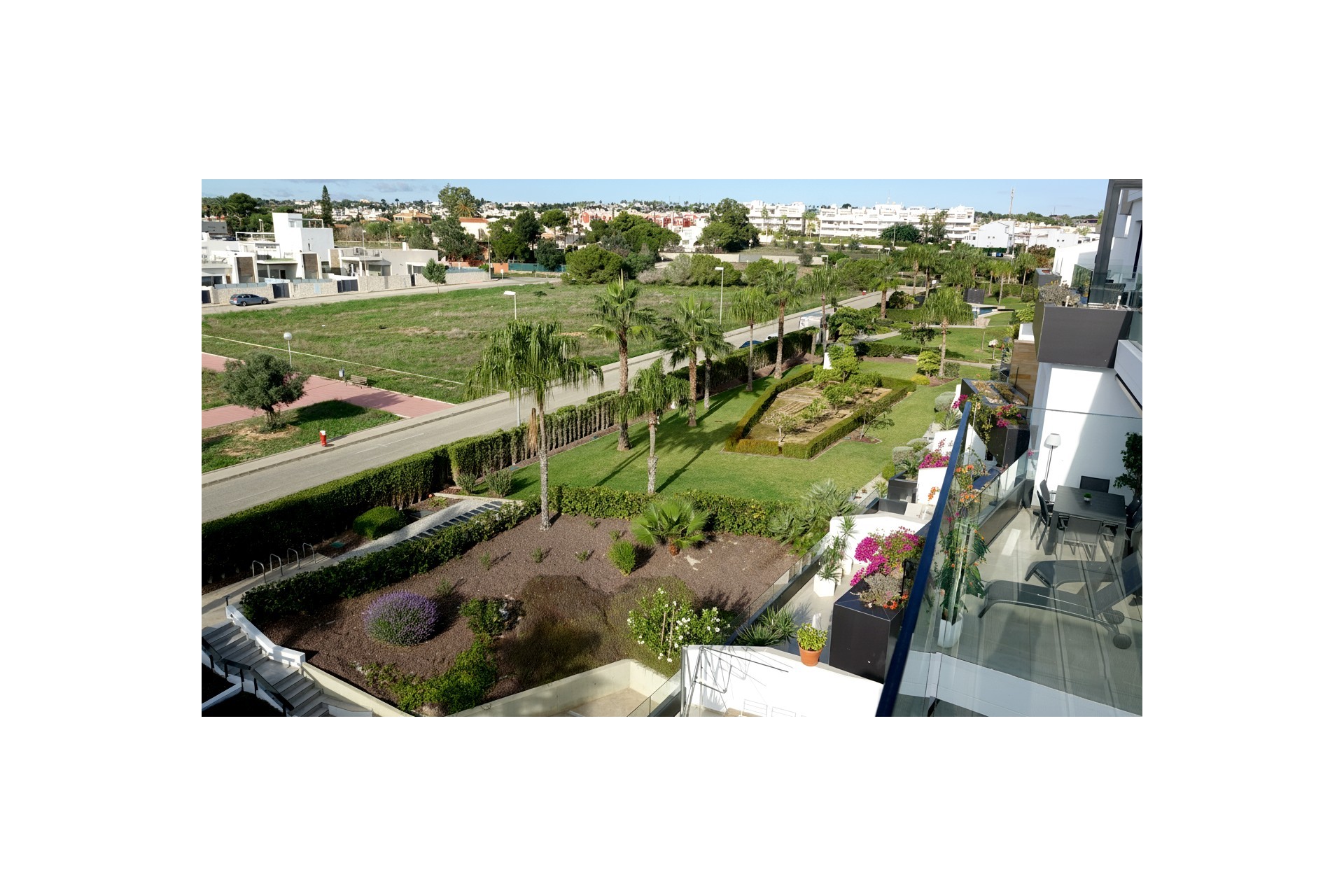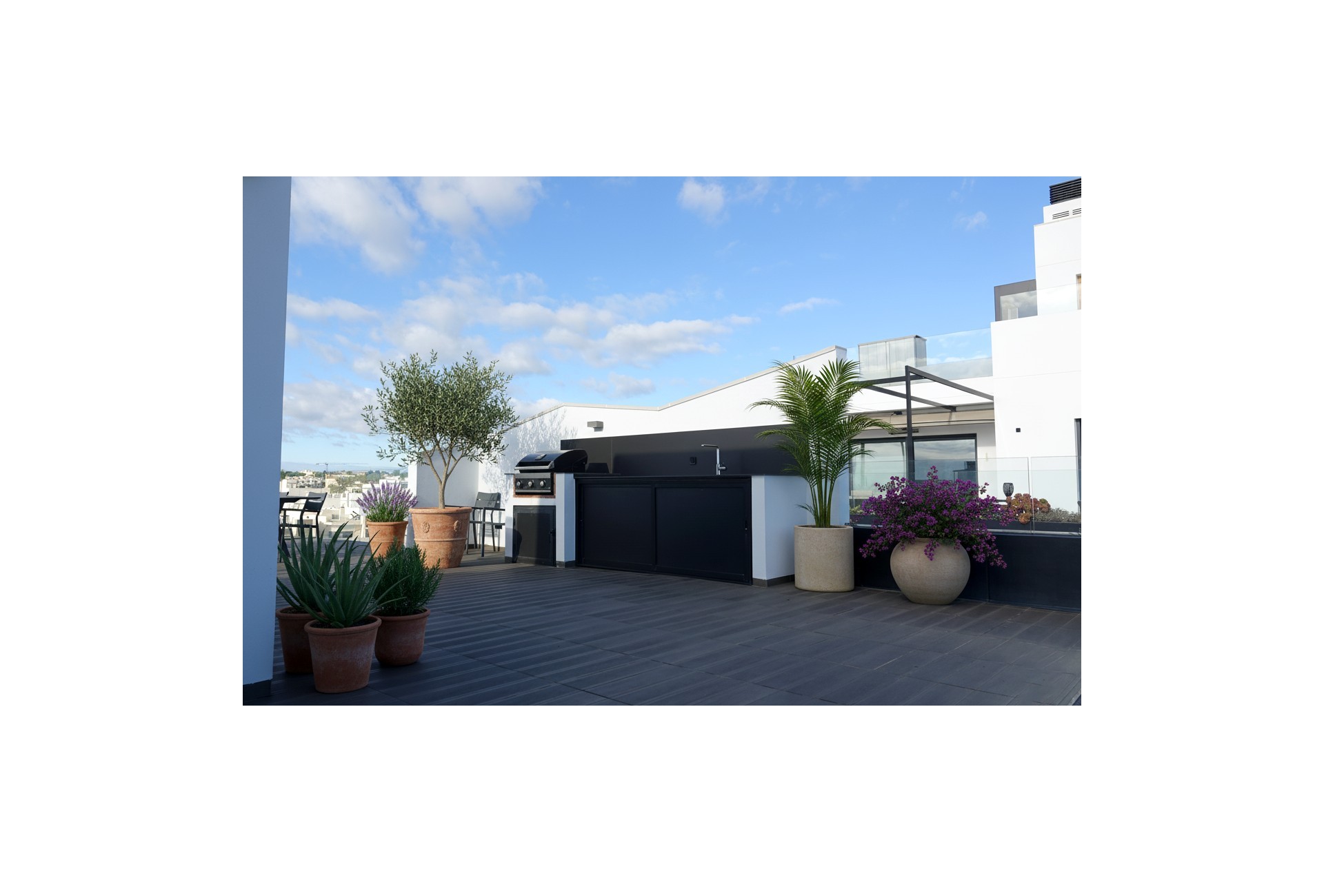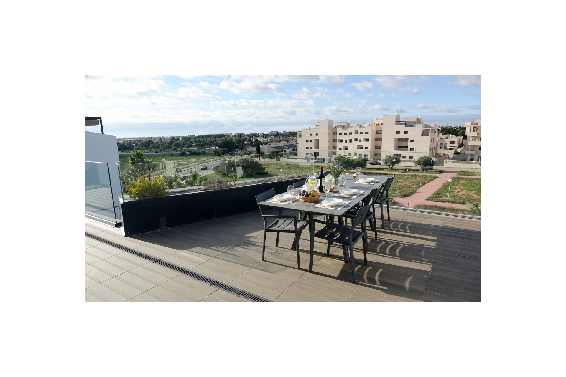 Denna lyxiga takvåning med hög standard ligger i Villamartin, i ett gated community med faciliteter som gym, spa, grönområden och gemensam pool. Den har ett oslagbart läge, nära stormarknader, restauranger, barer, butiker, det kommersiella centrumet La Zenia Boulevard, golfbanan Villamartin och nära stränderna. Takvåningen har 3 sovrum med inbyggda garderober + 2 badrum med duschkabiner och golvvärme. Denna moderna takvåning är mycket ljus och har stora fönster och glasdörrar. Det finns en enorm terrass på 76m2 med utgång från vardagsrummet och sovrummet. Utöver det finns det också ett massivt solarium på 116 m2 med sommarkök, grill och en privat pool med fantastisk utsikt ända ner till havet! Denna takvåning säljs fullt möblerad med alla apparater och dessutom har den 3 parkeringsplatser i underjordiska garage + 3 förråd! Fantastisk möjlighet, perfekt hus i perfekt skick och i perfekt läge! Ring oss och boka ditt besök!