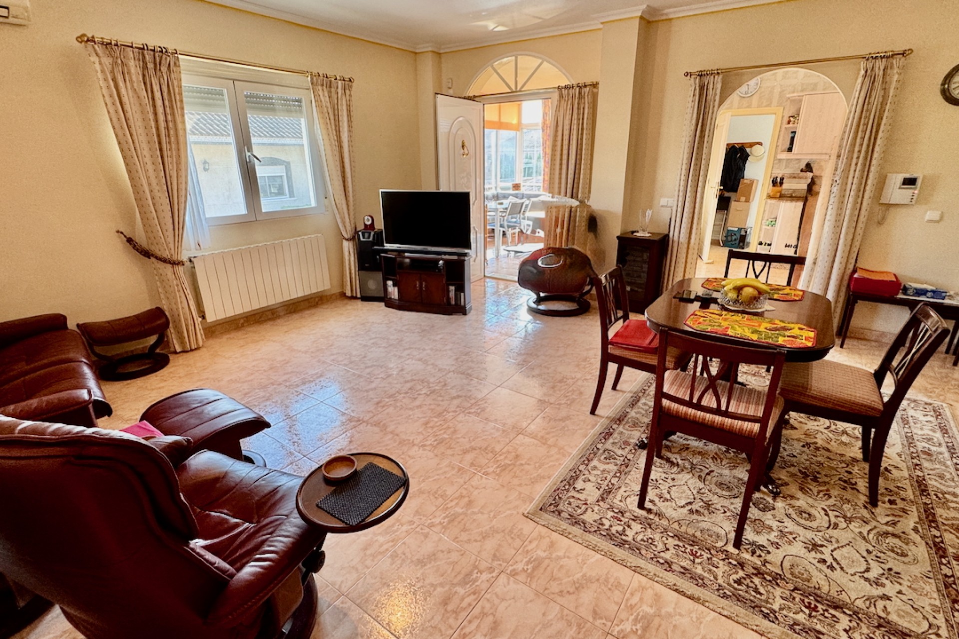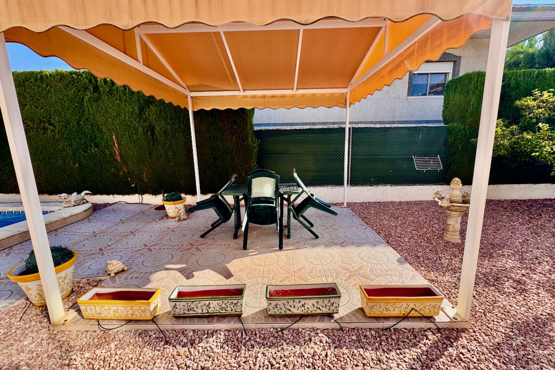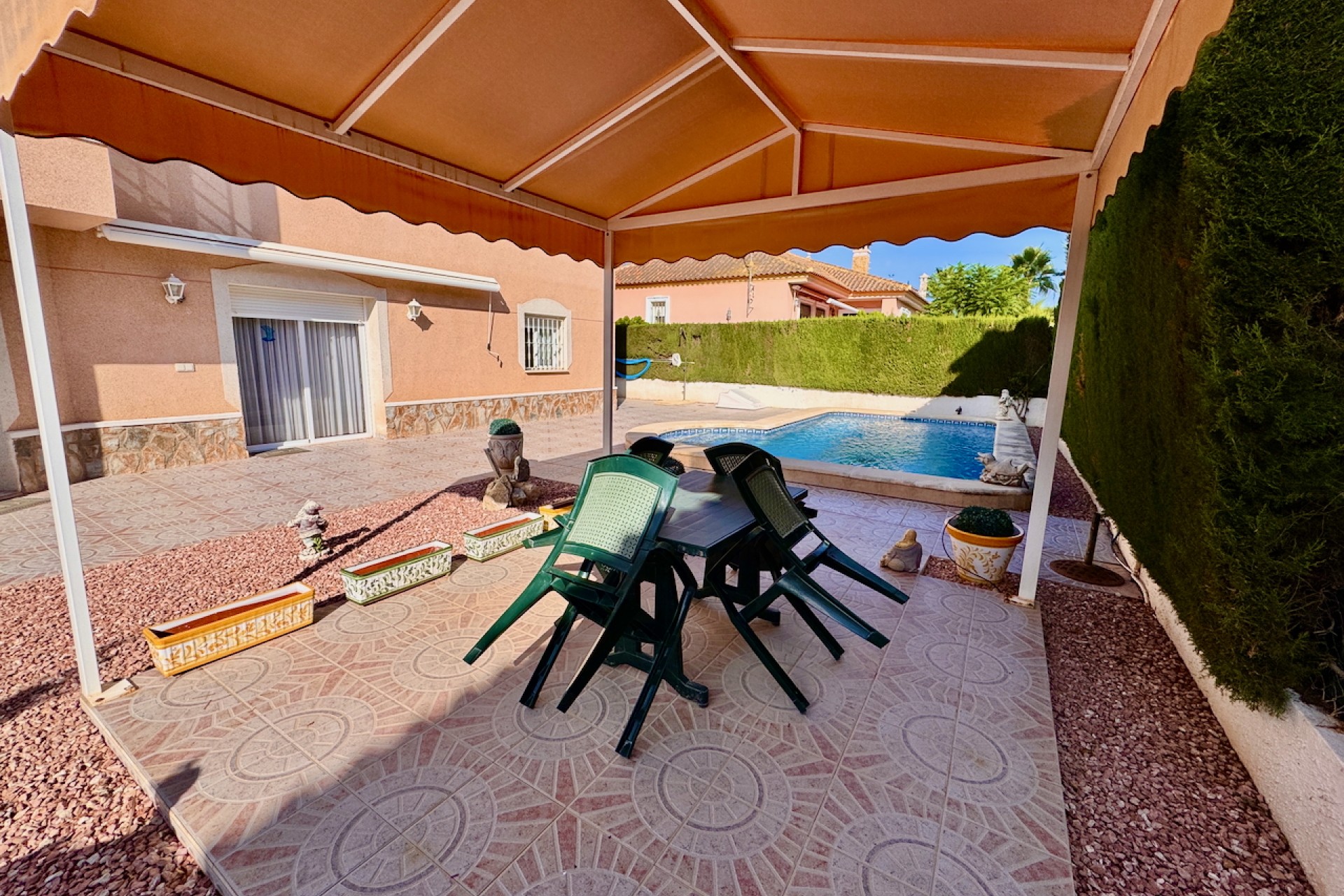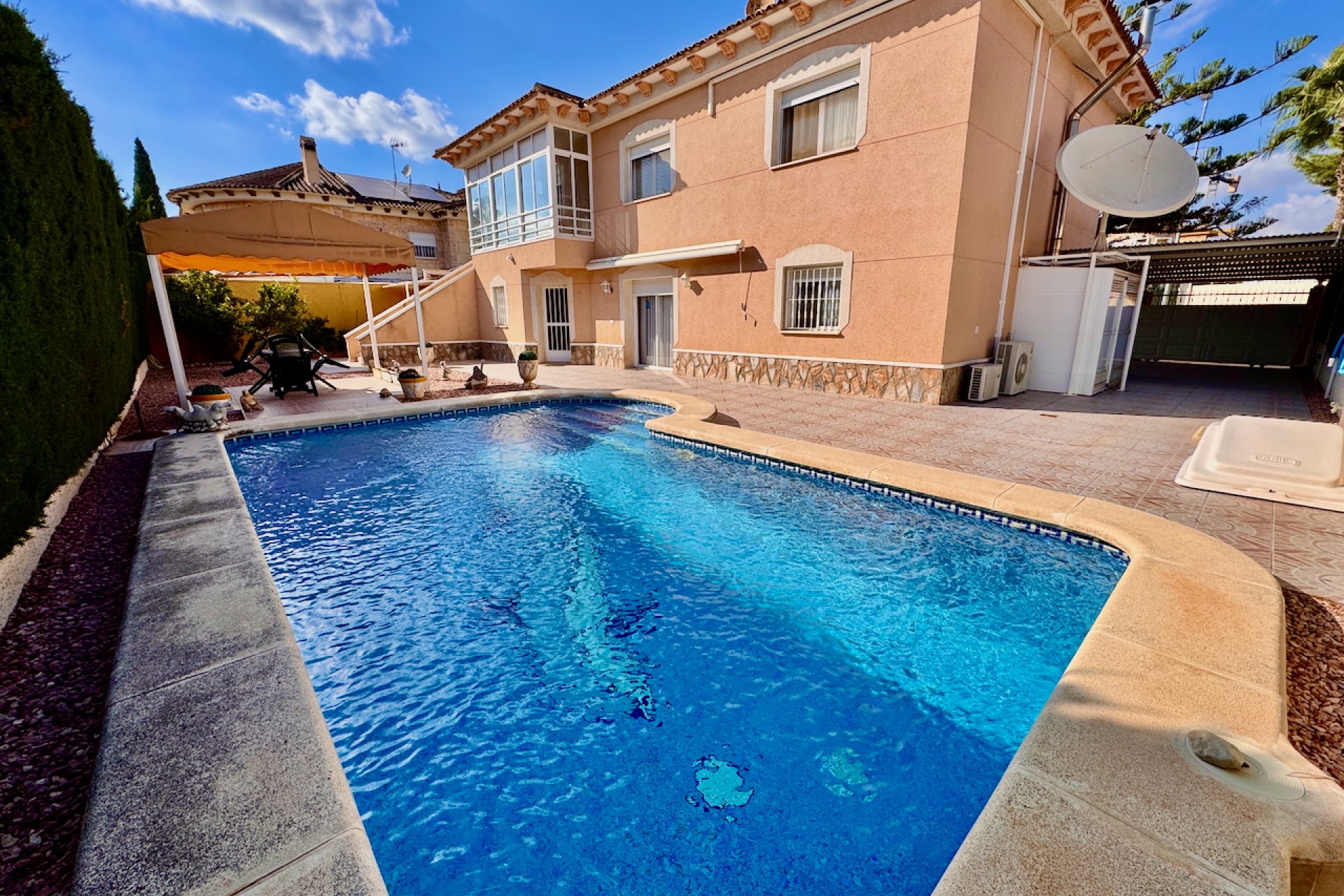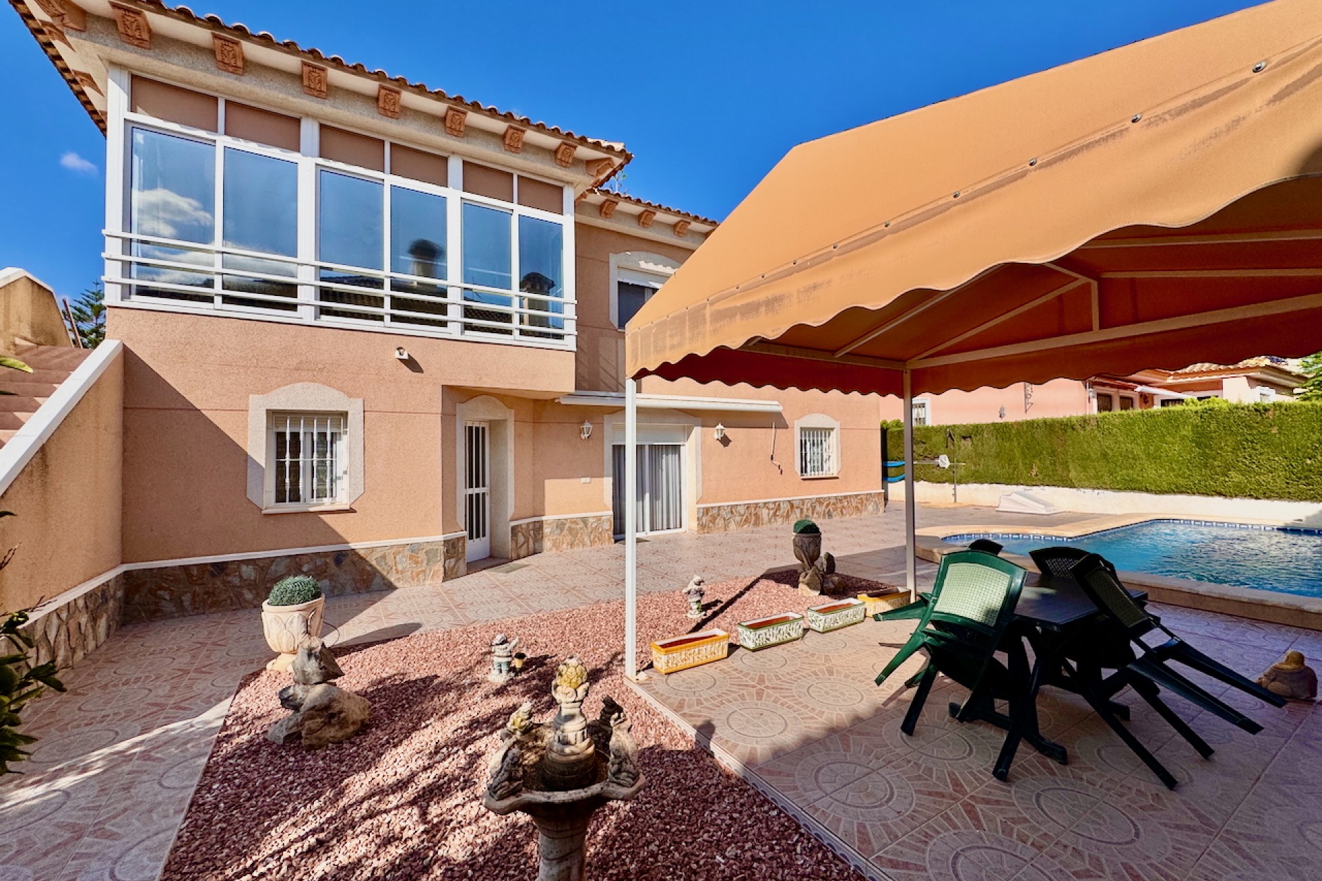 Gå ut till din egen privata pool, perfekt för avkoppling eller för att underhålla familj och vänner. Den privata terrassen och den inglasade terrassen utökar boytan utomhus, vilket gör den idealisk för att äta utomhus eller njuta av komfort året runt. Detta hem är i utmärkt skick och är redo att inflyttas.