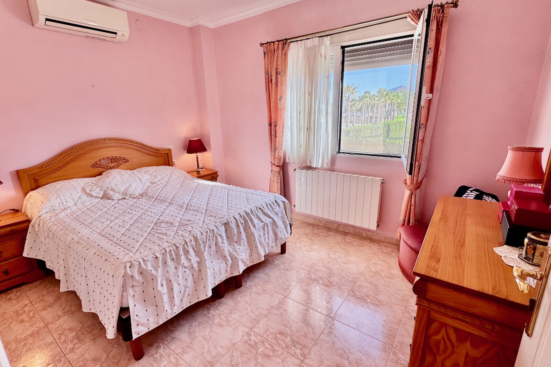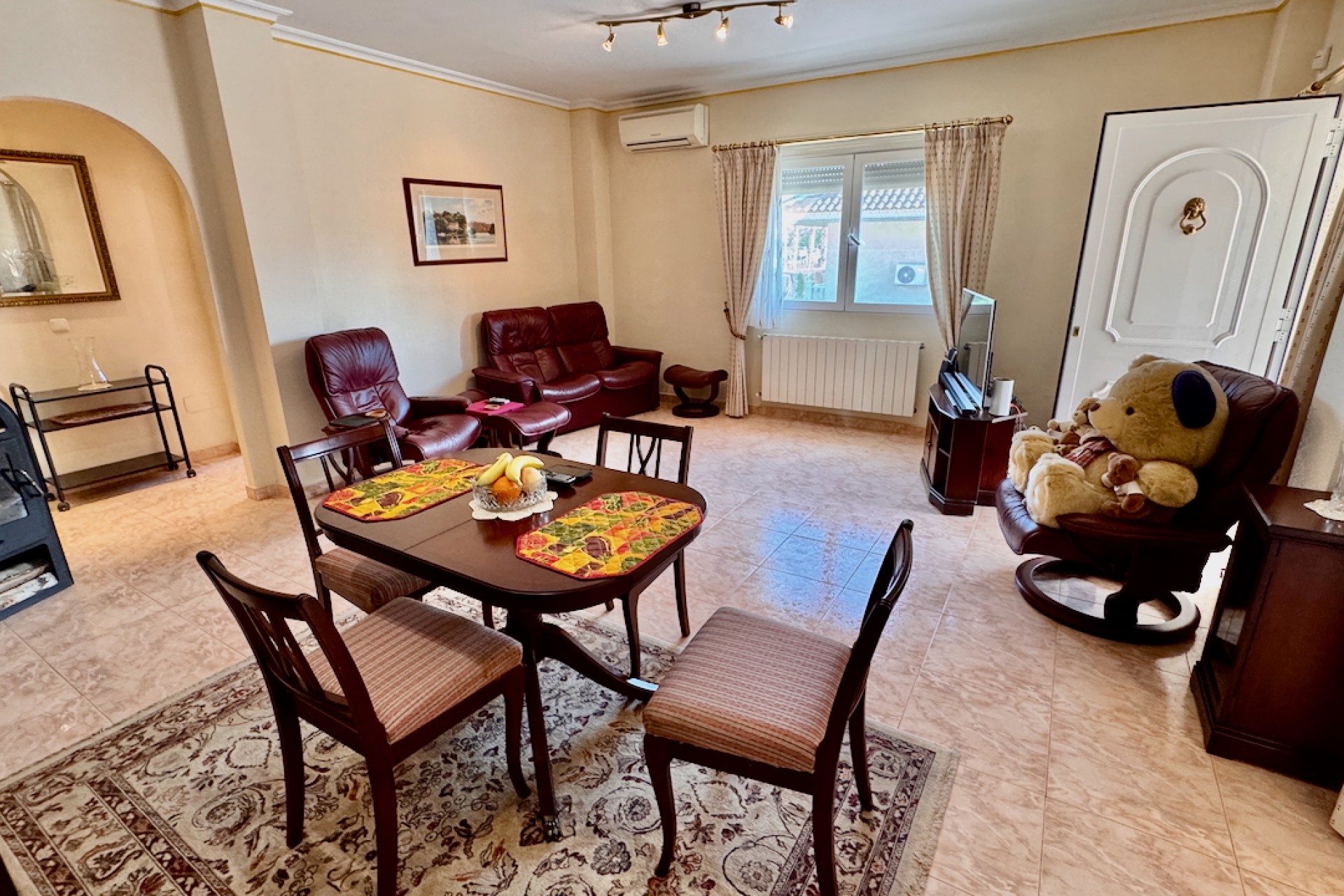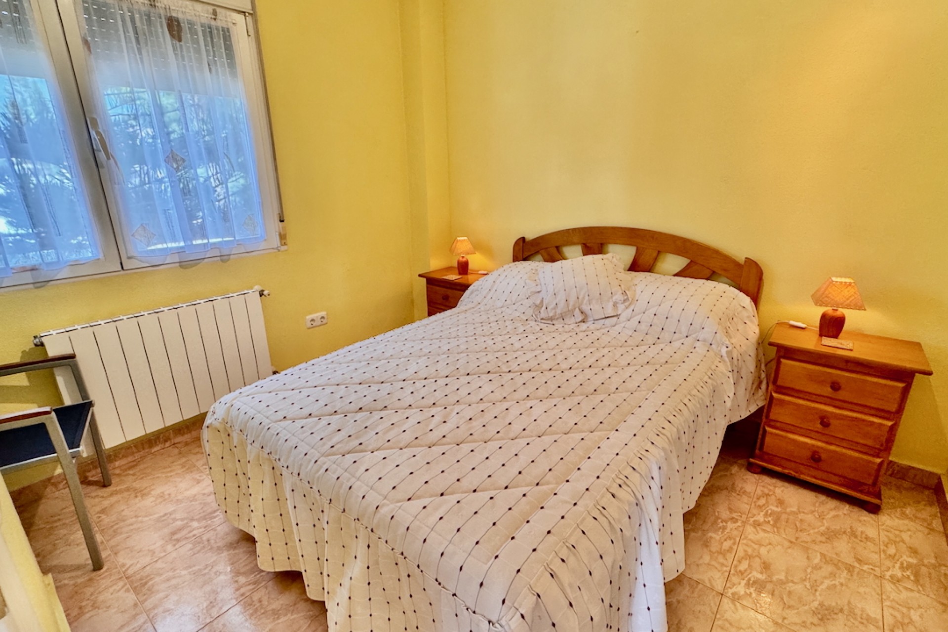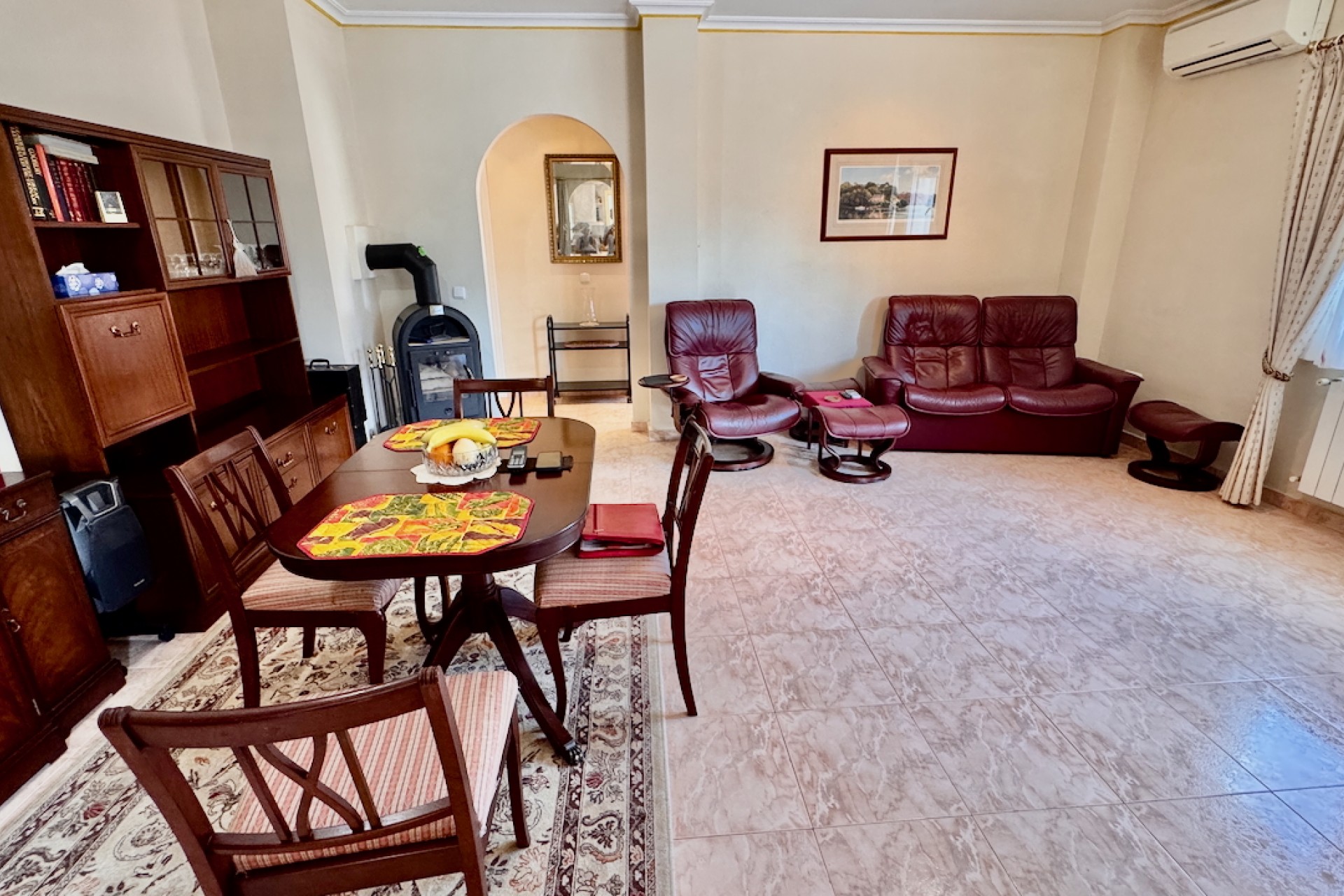 Fastigheten är designad för modernt boende och inkluderar luftkonditionering och oljebaserad centralvärme för komfort året runt, samt en öppen spis för extra charm under de kallare månaderna. Sovrummen med eget badrum erbjuder avskildhet och bekvämlighet, medan inbyggda garderober ger gott om förvaring. Ett separat kök med vitvaror säkerställer praktiska möjligheter, tillsammans med ett grovkök och ett stort förråd för extra utrymme.