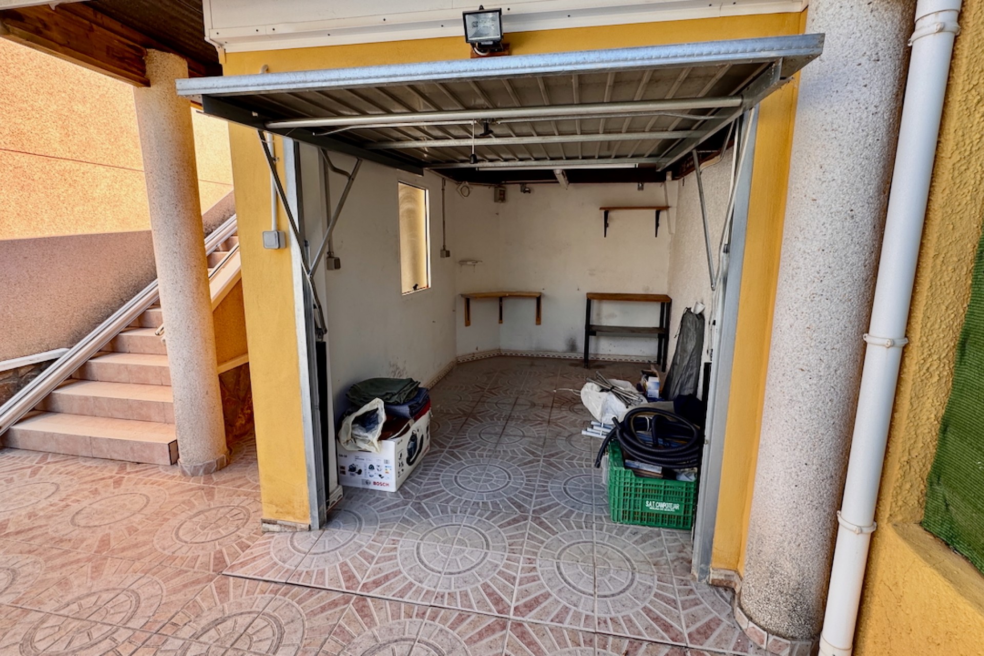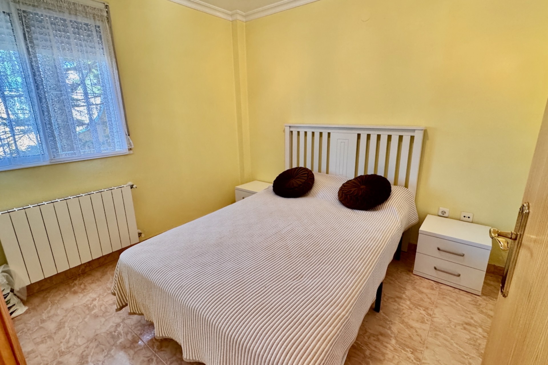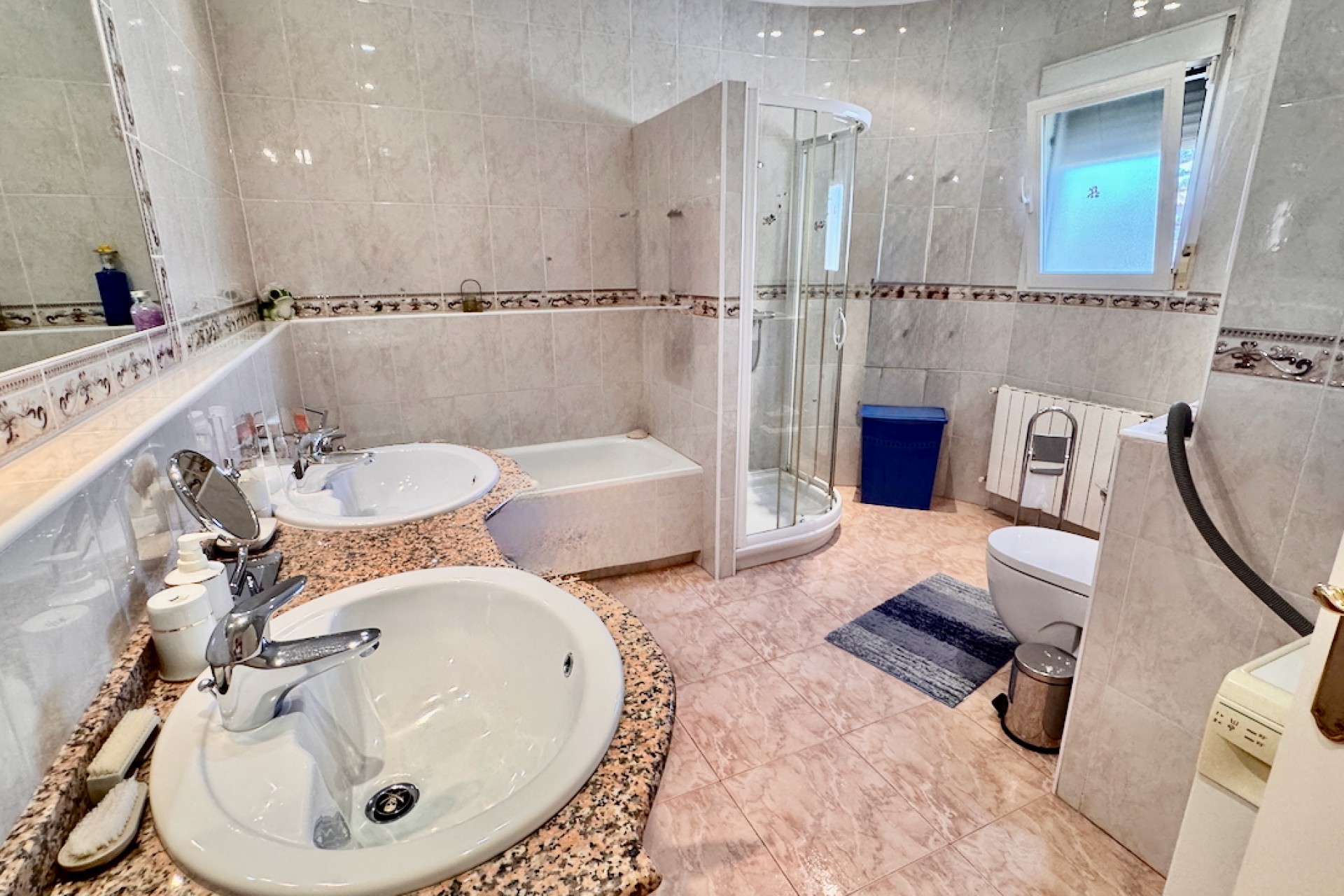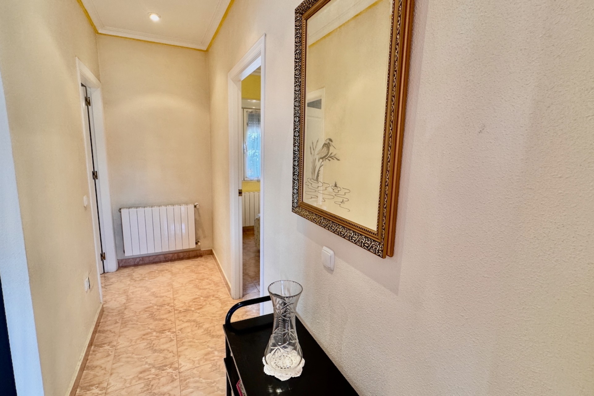 Fastigheten är designad för modernt boende och inkluderar luftkonditionering och oljebaserad centralvärme för komfort året runt, samt en öppen spis för extra charm under de kallare månaderna. Sovrummen med eget badrum erbjuder avskildhet och bekvämlighet, medan inbyggda garderober ger gott om förvaring. Ett separat kök med vitvaror säkerställer praktiska möjligheter, tillsammans med ett grovkök och ett stort förråd för extra utrymme.