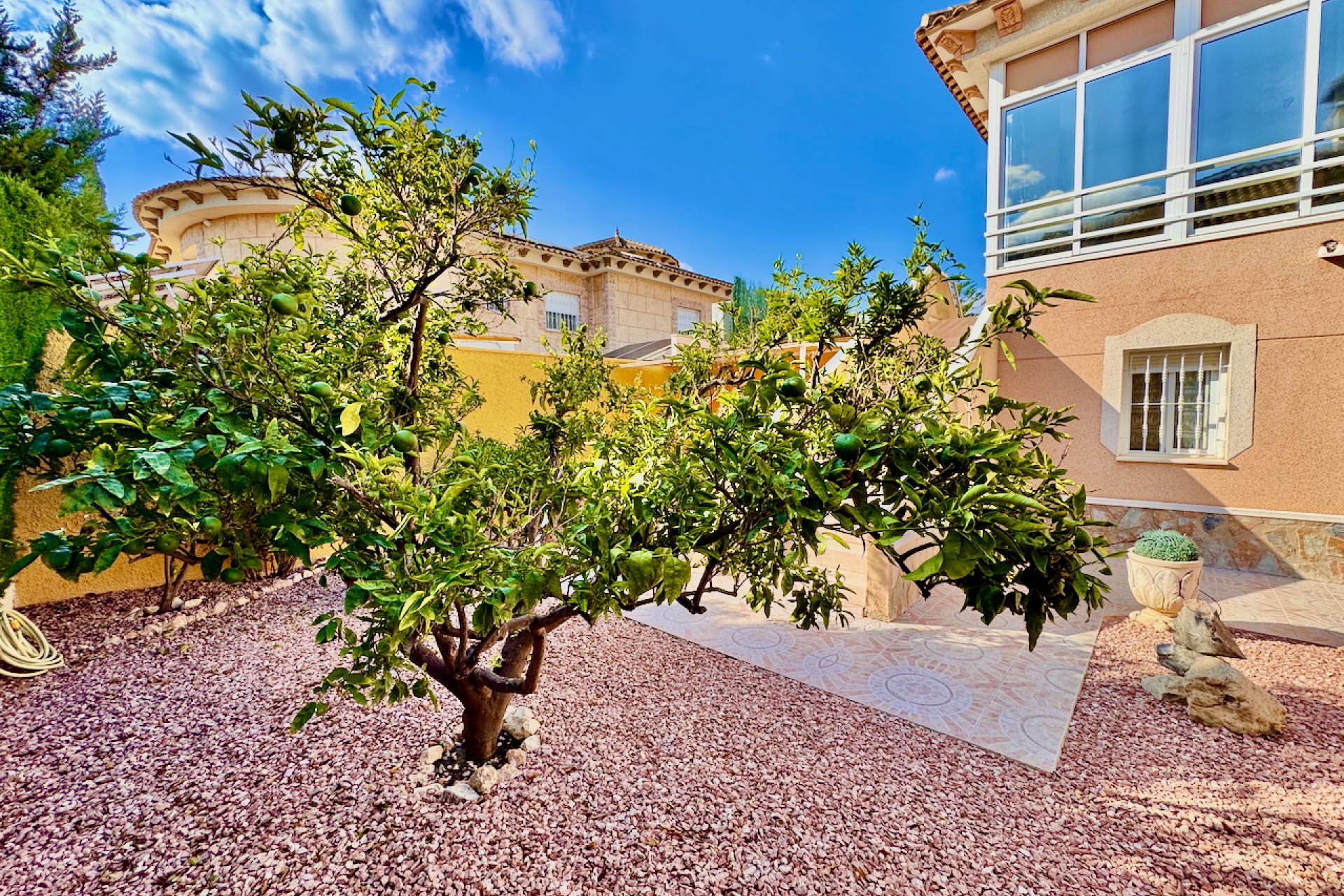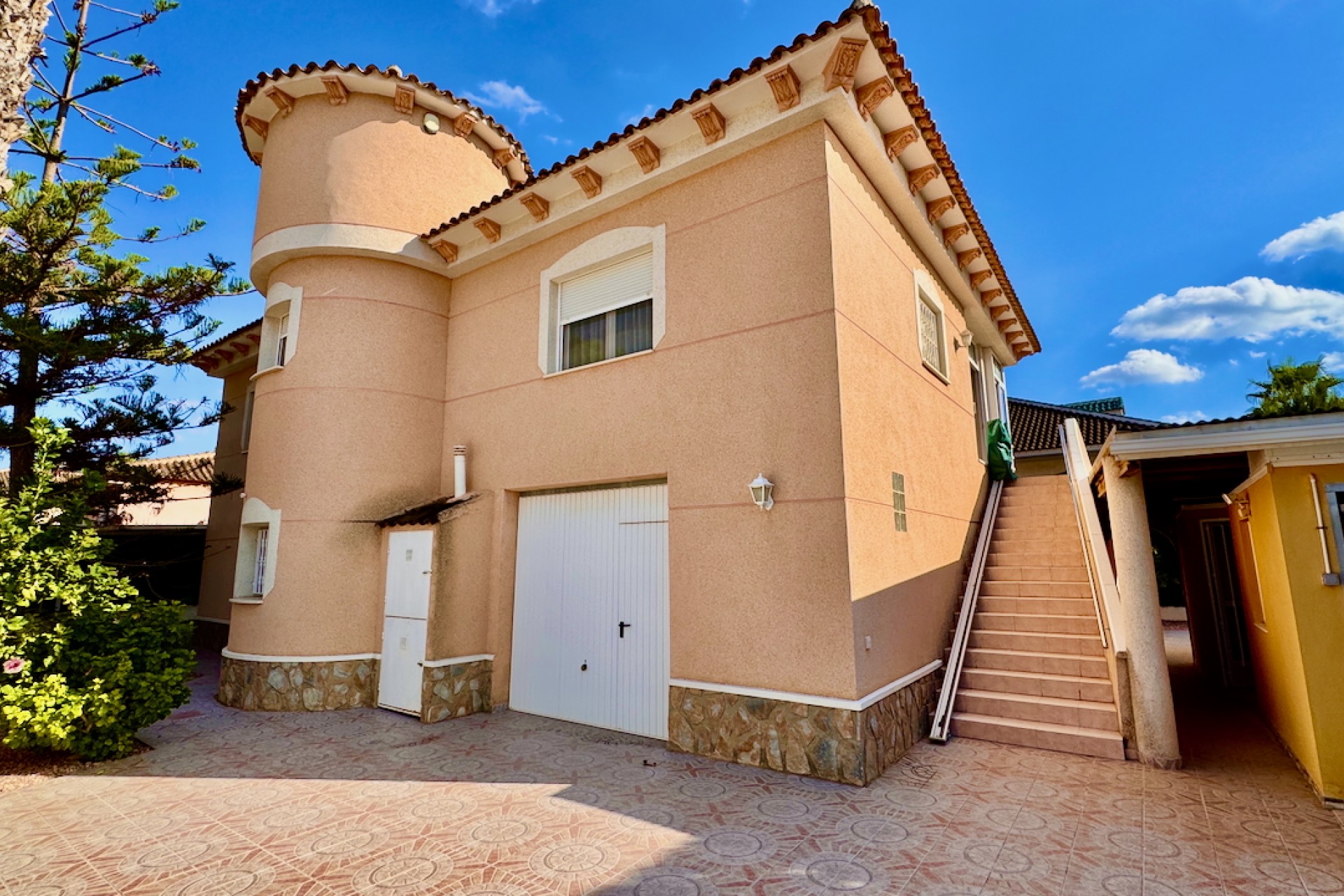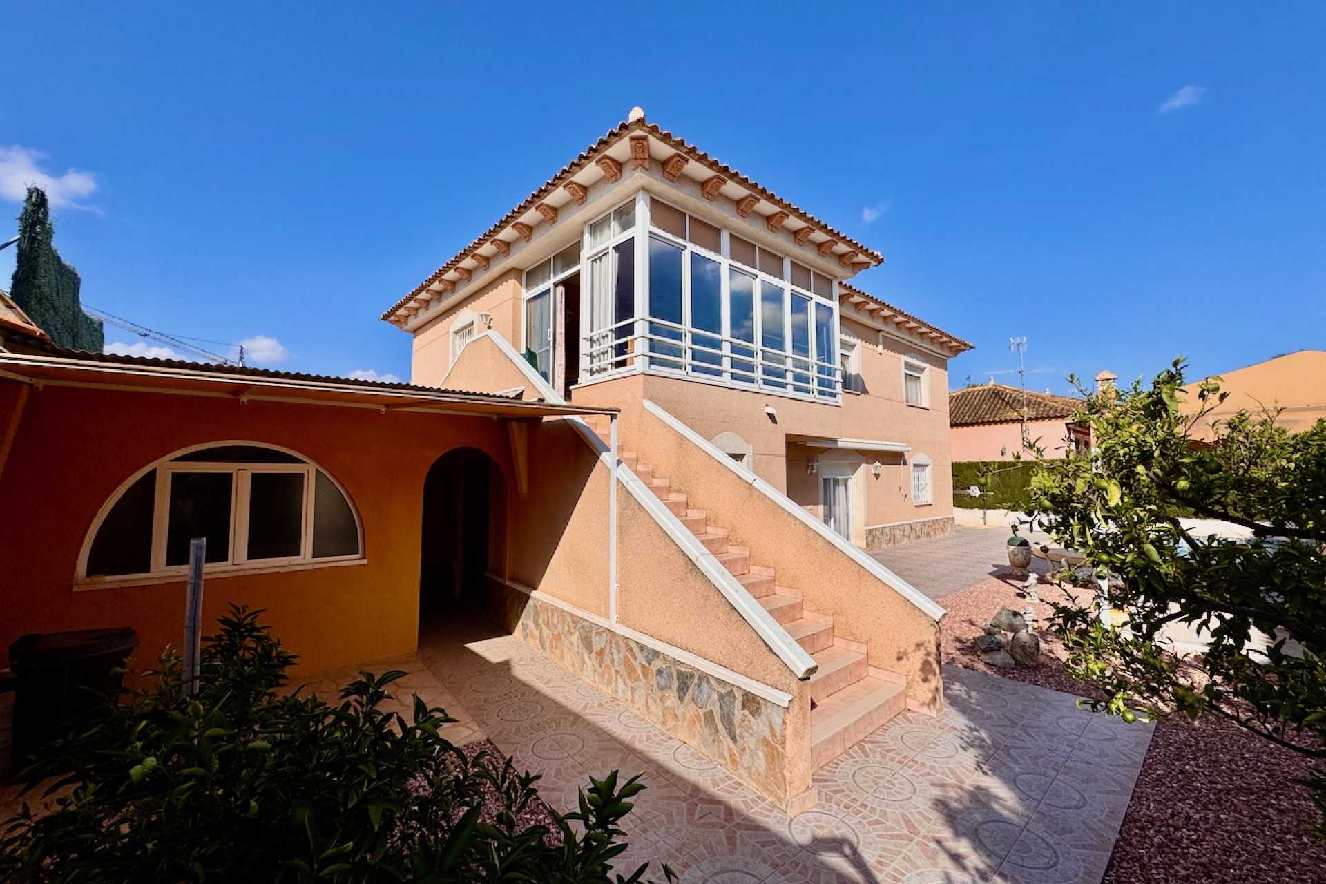 Denna exceptionella fastighet erbjuder en rymlig planlösning med ljusa, luftiga interiörer fyllda med naturligt ljus, vilket skapar en välkomnande atmosfär. Med sitt söderläge njuter huset av solsken hela dagen, kompletterat av utsikt över trädgården och poolen som utgör en lugn bakgrund.