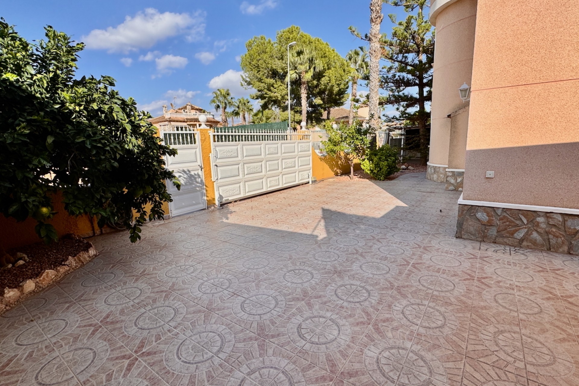 Exteriören är lika imponerande, med en grindad entré med elektriska grindar för ökad säkerhet, samt parkering utanför vägen, en carport och ett garage. De lättskötta trädgårdarna har förbättrats med utomhusbelysning, vilket kombinerar skönhet med praktiska egenskaper.
