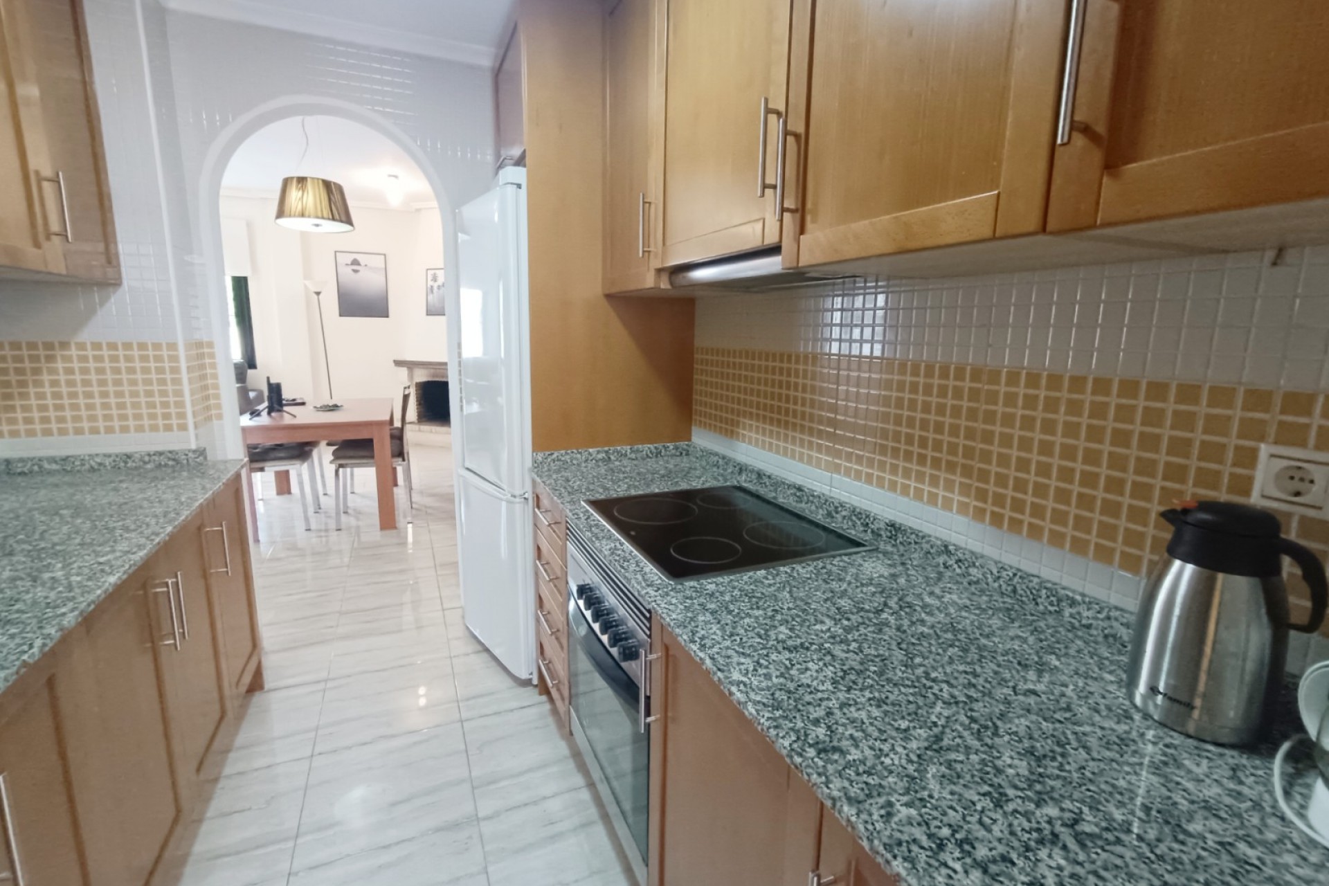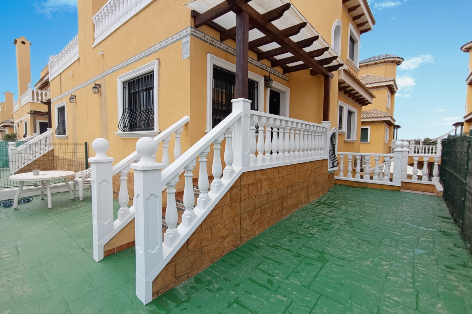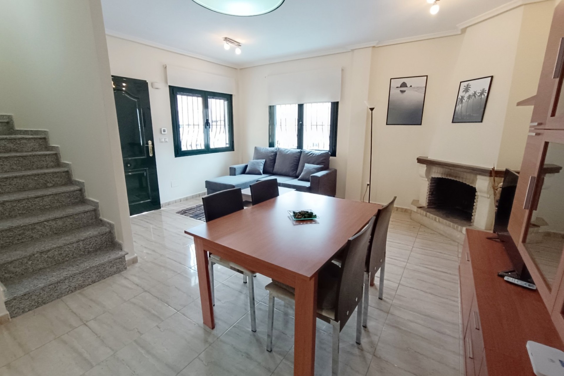 Denna fastighet ligger i ett litet område i utkanten av Lo Marabu, en attraktiv förort till Ciudad Quesada. Du kan promenera till många barer, restauranger och stormarknader, och det är nära huvudvägen till Torrevieja, Guardamar och motorväg AP7. Fastigheten har ett rymligt vardagsrum och matplats, kök med gott om arbetsyta, skåp, inbyggd ugn/spis och fläkt samt ett praktiskt tvättstuga. Alla sovrum är av god storlek med inbyggda garderober, varav ett ligger på bottenvåningen. På bottenvåningen finns också ett praktiskt duschrum. Trappa leder ner till en stor källare som kan användas för en mängd olika ändamål. Ett extra sovrum kanske? Spelrum, hobbyrum eller kanske ett hemmakontor eller litet företag. På övervåningen finns ytterligare två sovrum, återigen dubbelt så stora med inbyggda garderober. En dörr leder ut till en terrass, perfekt för morgonkaffe. Det finns också en ytterligare trappa upp till ett privat solarium med plats för solstolar. Utanför finns lättskötta trädgårdar, en uppfart och separat tillgång till källaren/lägenheten. De boende har också tillgång till ett stort gemensamt område med barn- och vuxenpool samt duschar och skuggiga områden. Huset säljs som det ser ut, med möbler och vitvaror samt ett kök i källaren. Installerat med luftkonditionering och tvåglasfönster.